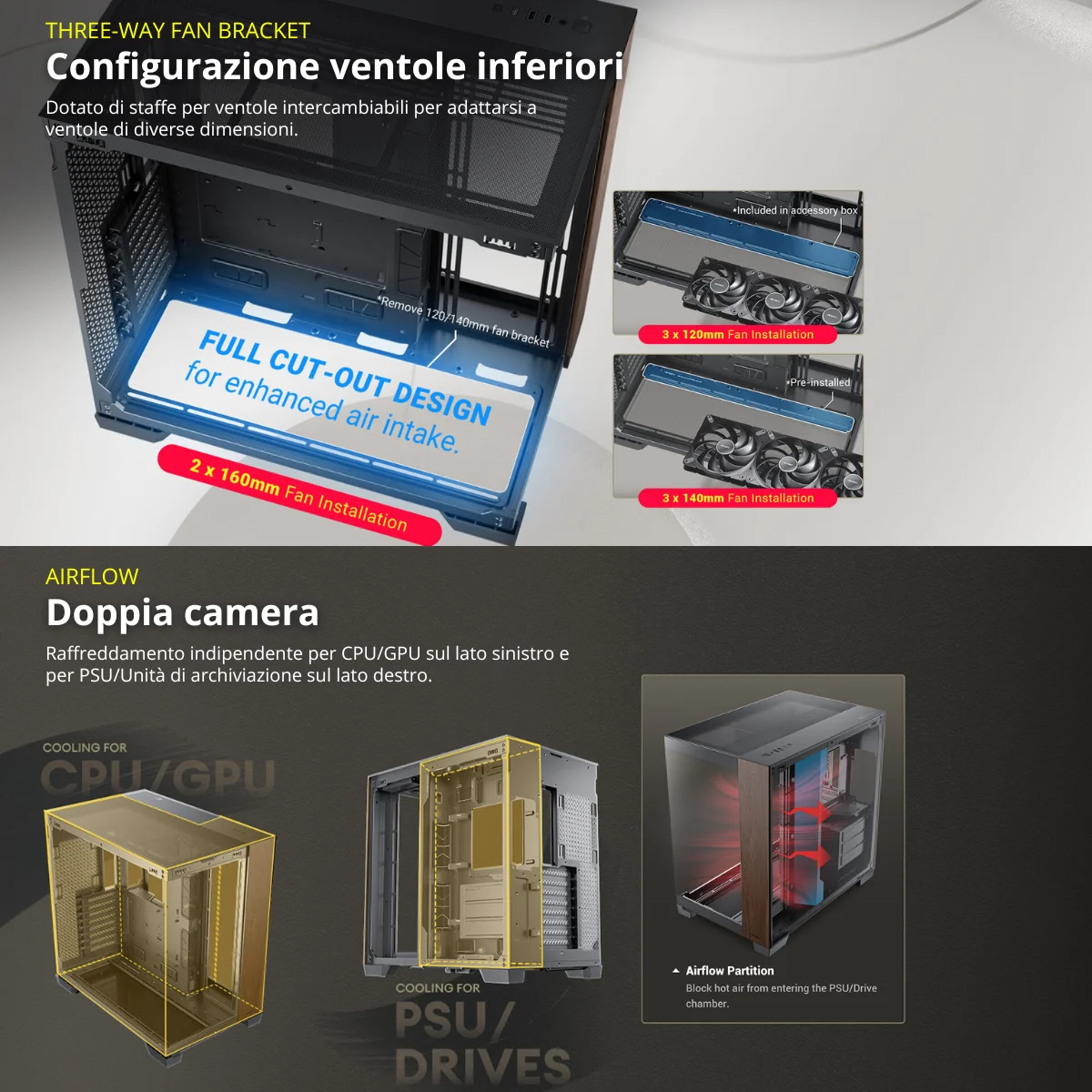 Dual Chamber Design per raffreddamento indipendente CPU/GPU e PSU.