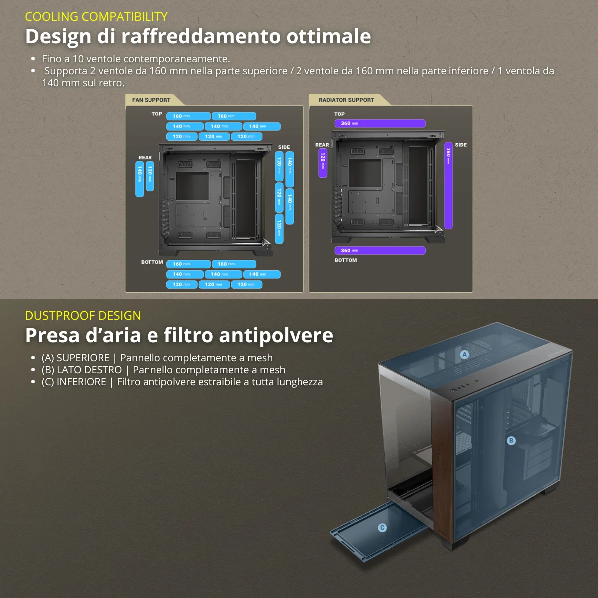 Il raffreddamento è al centro del progetto: supporta fino a 10 ventole contemporaneamente, incluse configurazioni con ventole da 160mm, oltre a radiatori spessi da 360mm installabili contemporaneamente su top, bottom e lato.