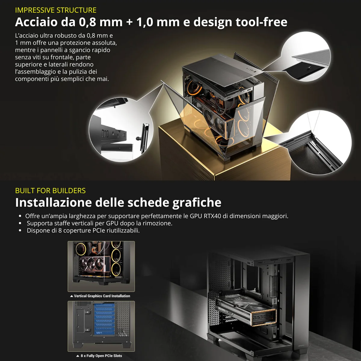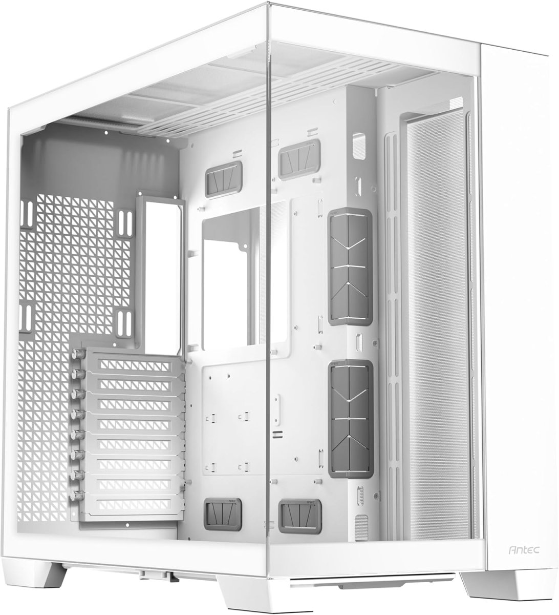 Il C8 Black di Antec unisce un’estetica moderna e minimalista con un’architettura interna progettata per build di fascia alta. I pannelli in vetro temperato con taglio a 45° offrono una visuale panoramica a 270° senza interruzioni, perfetta per mostrare componenti high-end e illuminazione RGB.