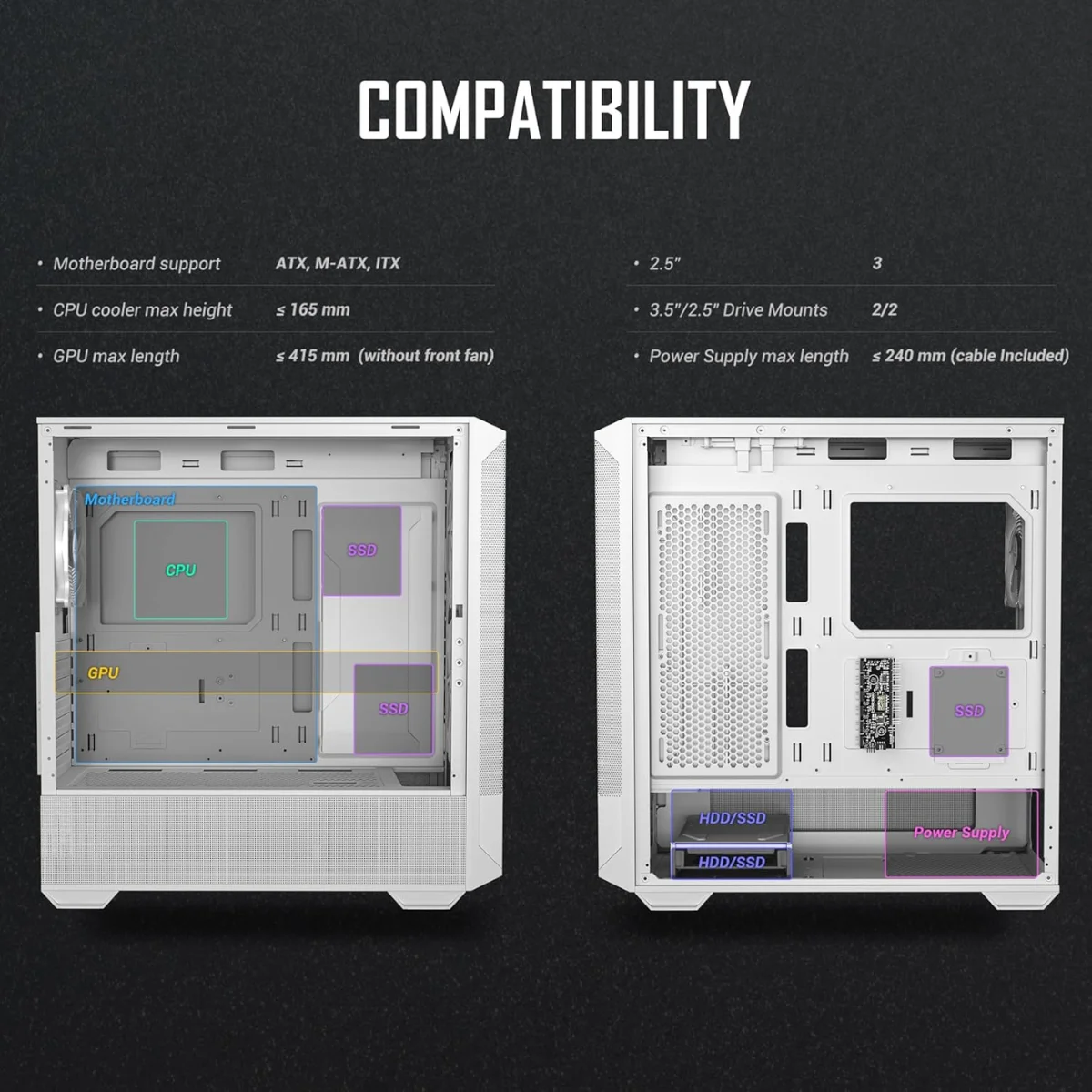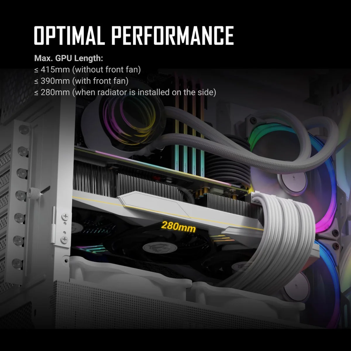 Con spazio per GPU fino a 415 mm, dissipatori CPU fino a 160 mm e 24 mm dedicati al cable management, il case è progettato per ospitare build potenti, ordinate e pronte a brillare.