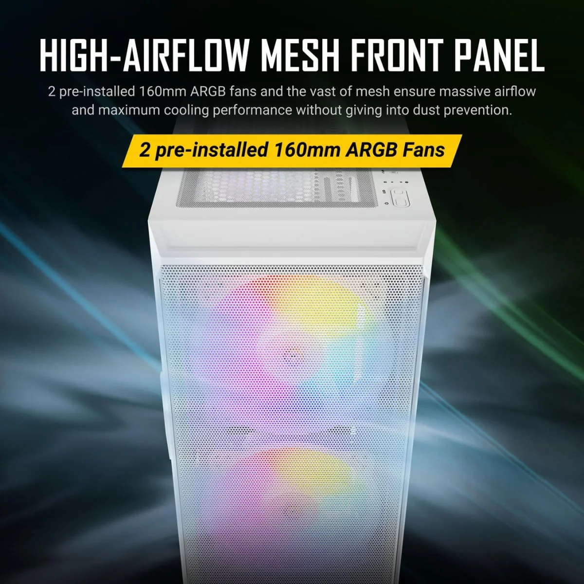 Il case include 2 ventole frontali ARGB da 160 mm e 1 ventola ARGB aggiuntiva, gestibili tramite controller LED/PWM integrato o direttamente dalla scheda madre, permettendo effetti luminosi personalizzati.