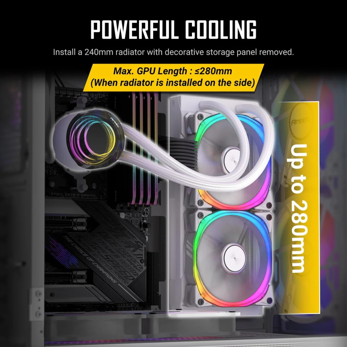 Il pannello laterale in vetro temperato con apertura a sportello facilita l’accesso ai componenti interni, semplificando installazione e manutenzione. Inoltre, grazie al supporto per radiatori fino a 240 mm e alla possibilità di montare fino a 11 ventole, garantisce un raffreddamento su misura per qualsiasi configurazione.