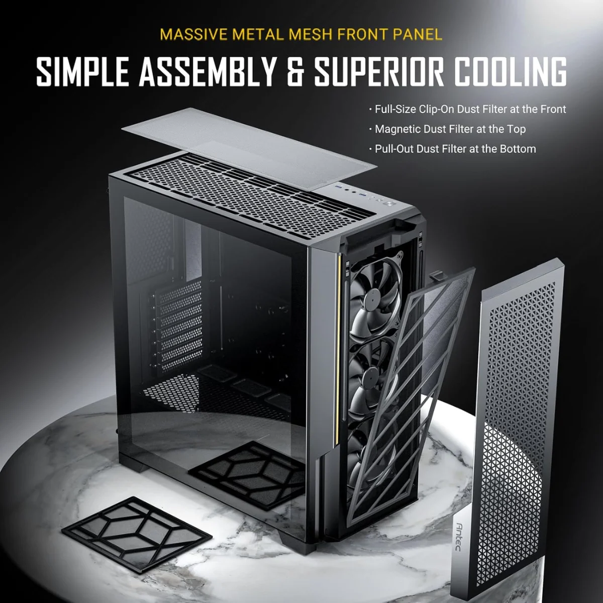 Massive Metal Mesh Front Panel: design frontale a maglia metallica per un flusso d’aria estremo, con filtri antipolvere completi (clip-on frontale, magnetico superiore, estraibile inferiore).