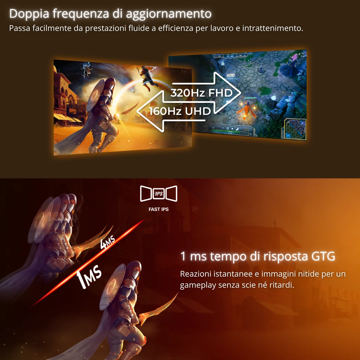 È una tecnologia che permette di scegliere tra due modalità di visualizzazione: UHD 160Hz per qualità e dettaglio o FHD 320Hz per fluidità estrema.