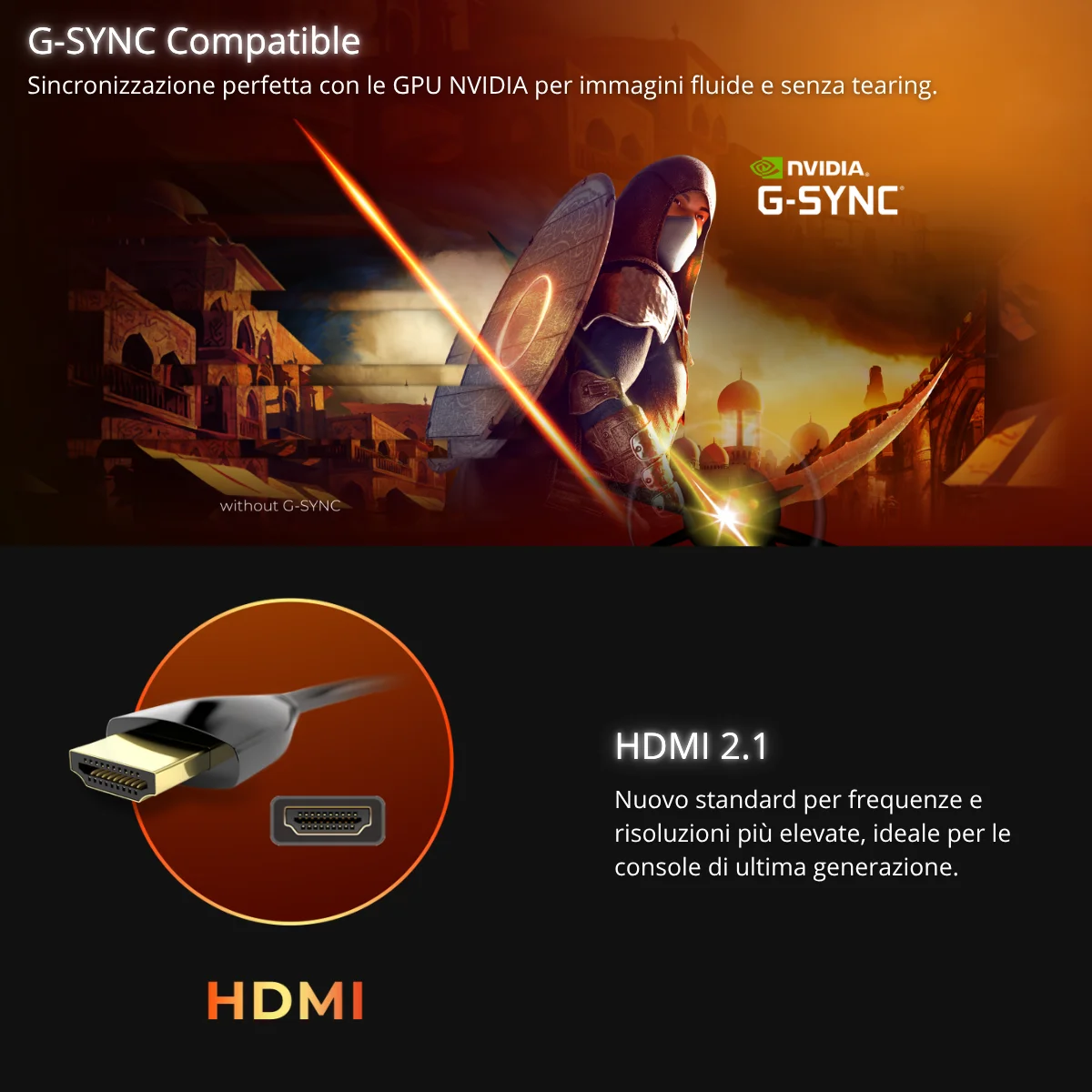 Compatibile con NVIDIA G-SYNC, il monitor sincronizza automaticamente la frequenza d’aggiornamento con la GPU, eliminando tearing e stuttering.