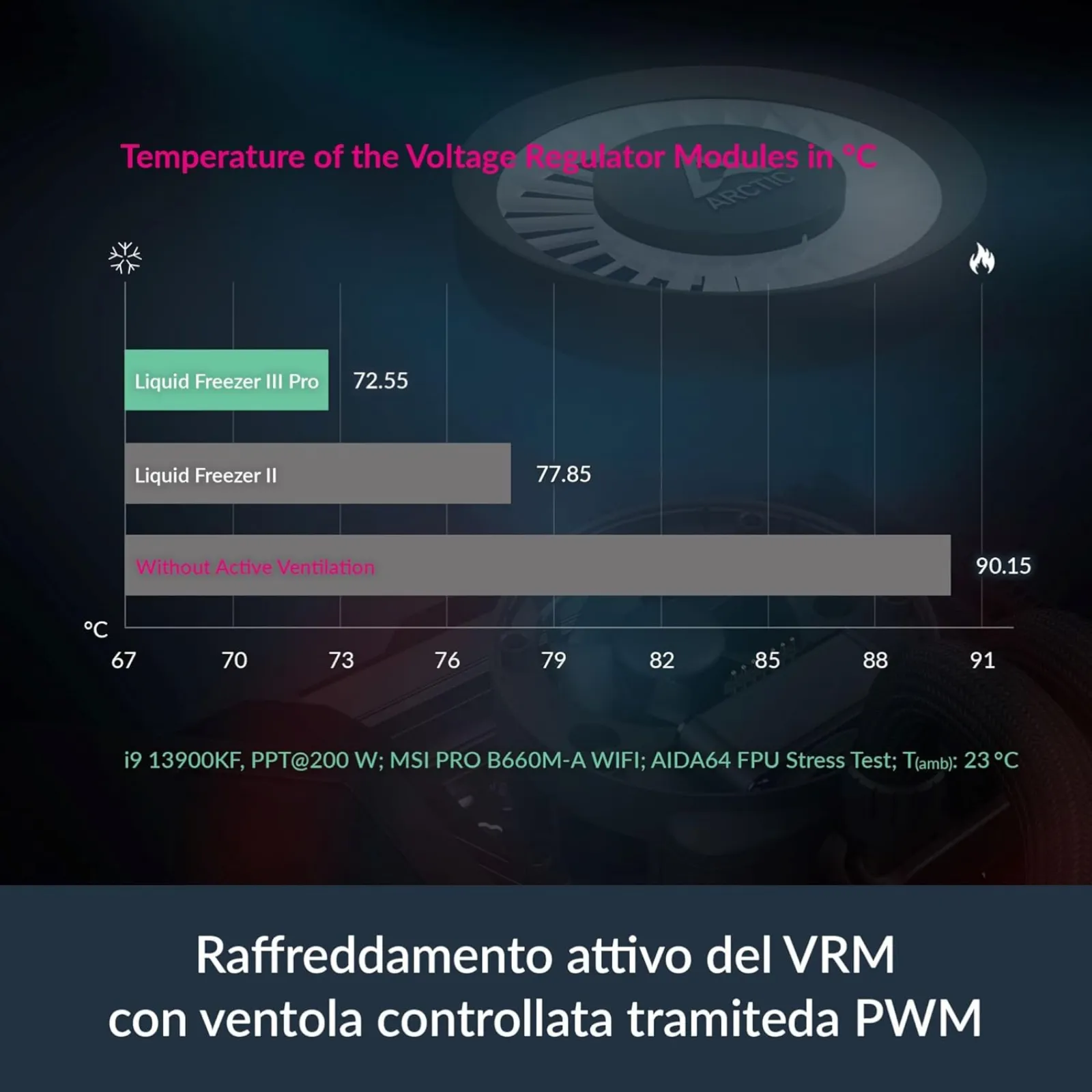 La ventola VRM PWM (400–2500 rpm) raffredda i regolatori di tensione della motherboard, riducendo le temperature nelle zone critiche e aiutando la stabilità del sistema durante sessioni intense.