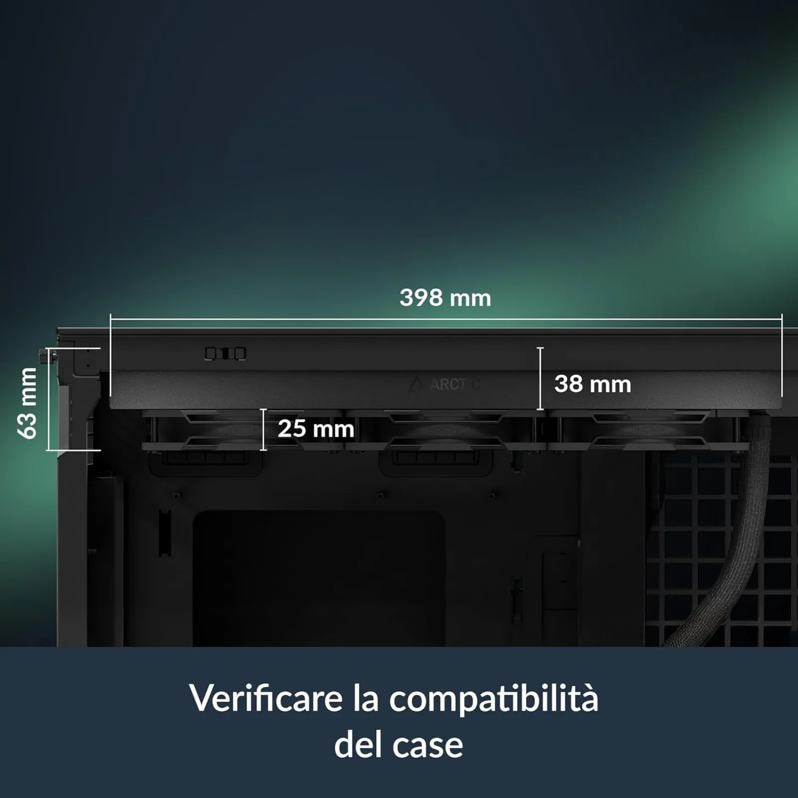 Il radiatore in alluminio 398×120×38 mm è più spesso dei classici 27 mm: aumenta la superficie e la capacità di liquido, gestendo meglio i picchi di temperatura.
