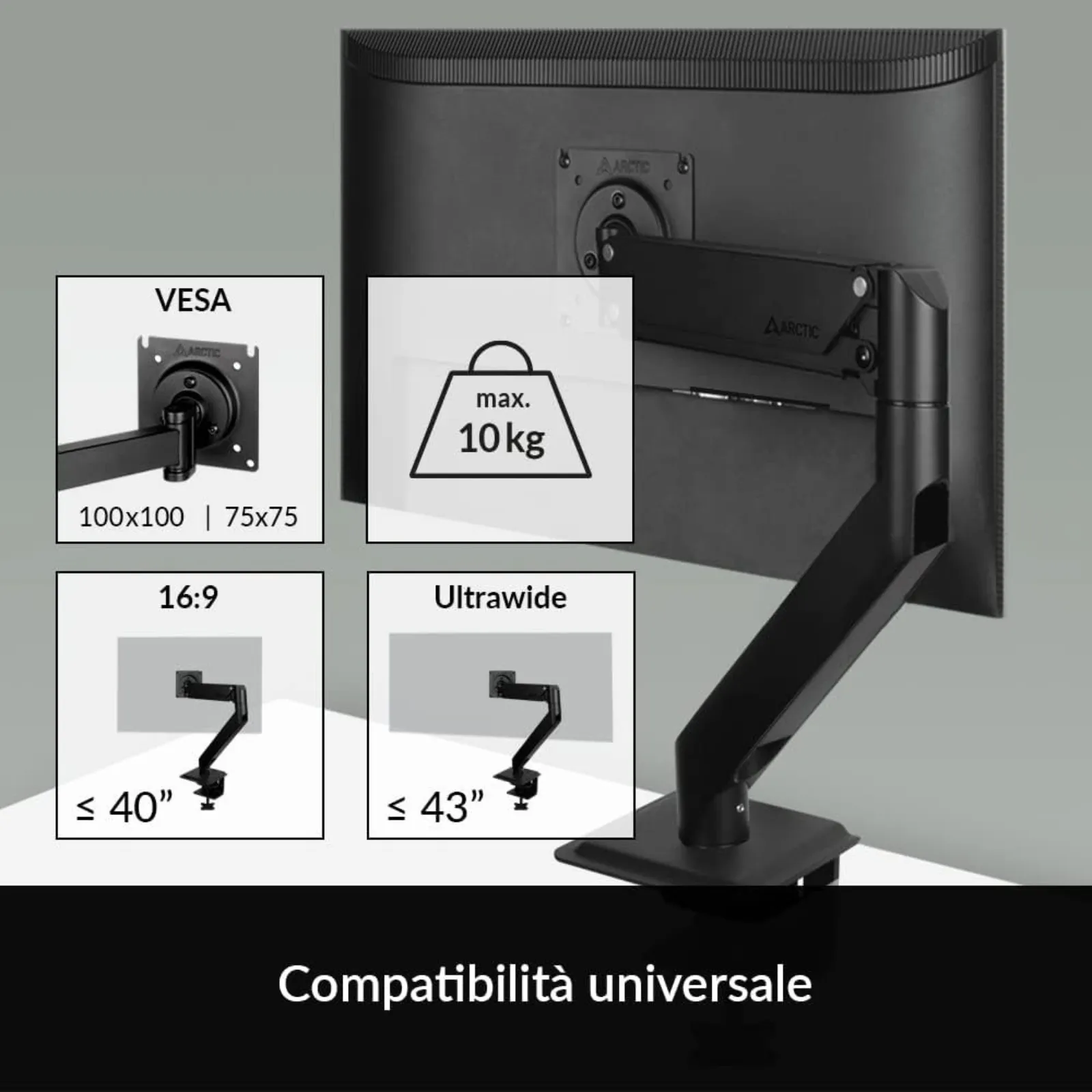 Supporta monitor 16:9 fino a 40″ e ultrawide fino a 43″.