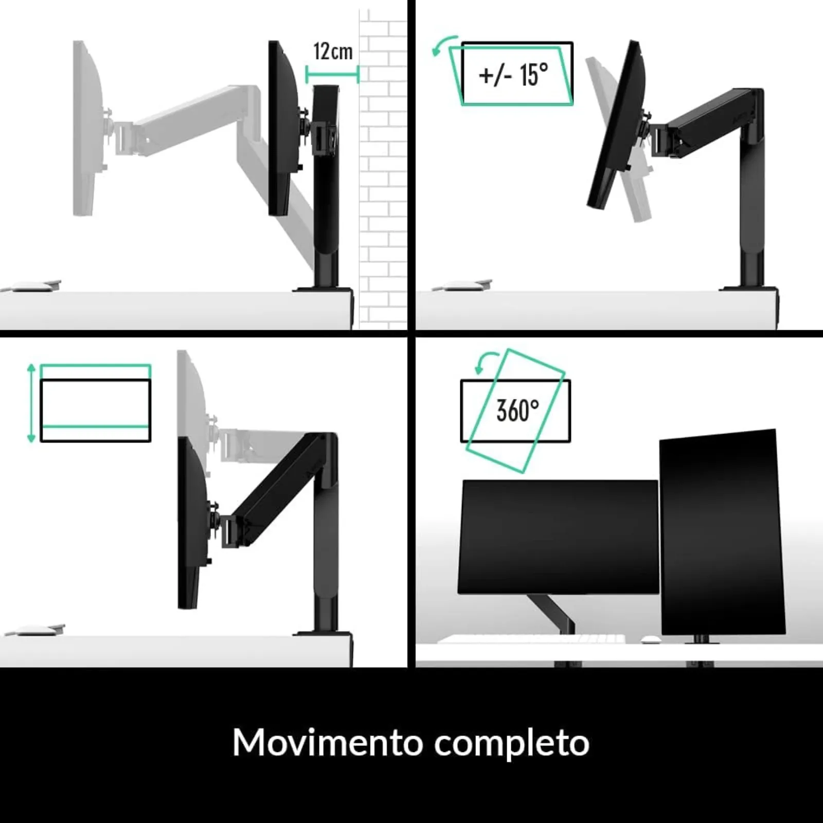 Il supporto trasforma qualsiasi monitor in una soluzione ergonomica, consentendo di posizionarlo alla giusta altezza e angolazione.