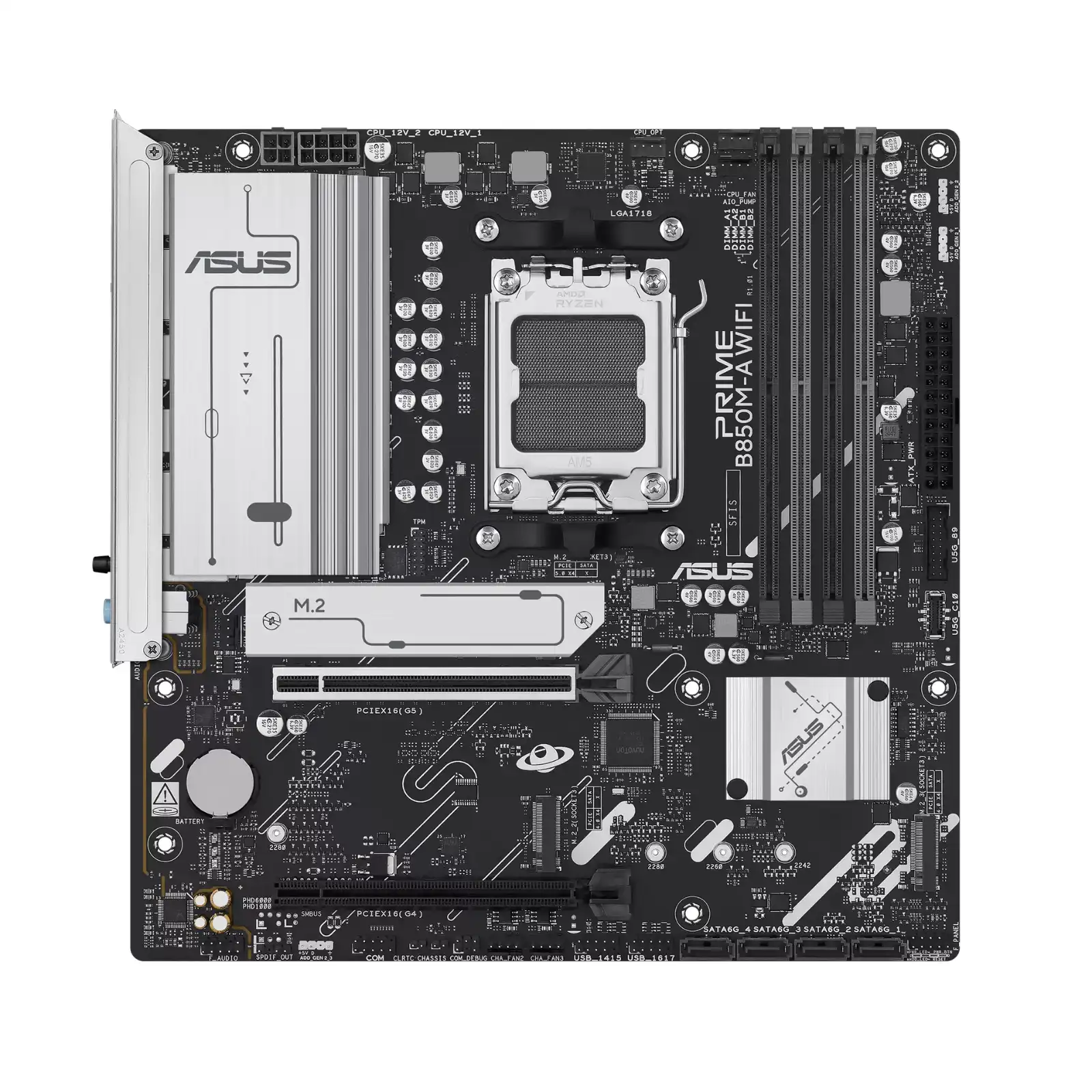 La ASUS PRIME B850M-A WIFI è una scheda madre in formato mATX progettata per offrire prestazioni affidabili e connettività moderna in build compatte. Il socket AM5 la rende compatibile con i processori desktop AMD Ryzen serie 9000, 8000 e 7000, offrendo una piattaforma aggiornata per gaming, lavoro creativo e utilizzo avanzato.