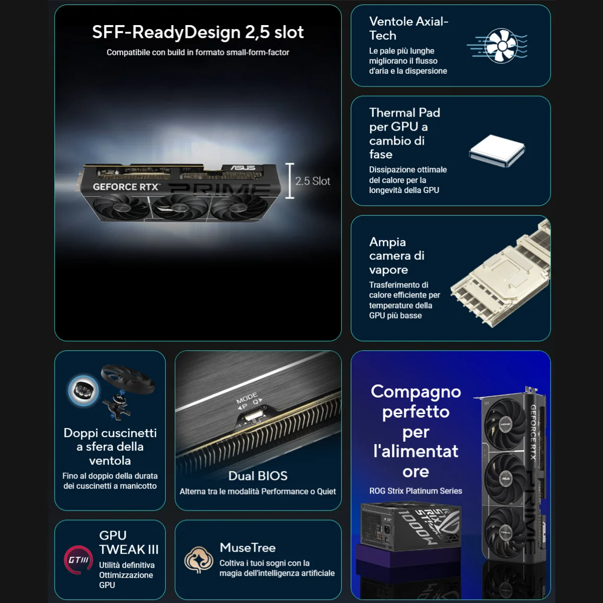 La ASUS PRIME GeForce RTX™ 5080 16GB OC Edition combina eleganza, potenza e raffreddamento di livello superiore in un formato SFF-ready da 2,5 slot.