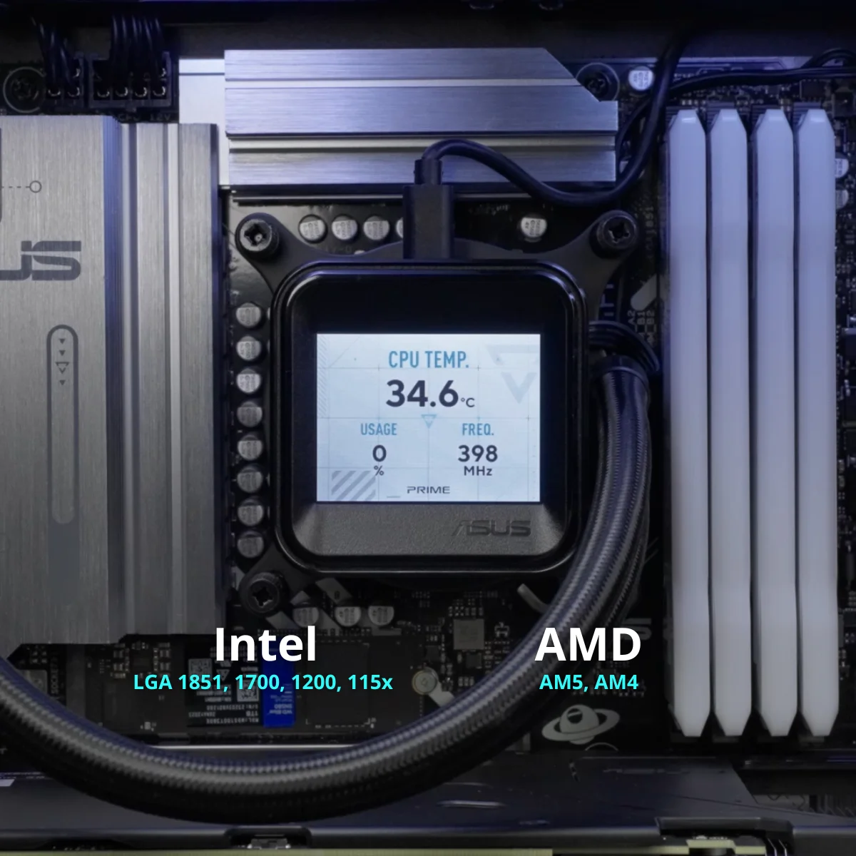 Il Prime LC 360 ARGB LCD è compatibile con i più recenti socket Intel® e AMD®, inclusi LGA1851 e AM5, garantendo ampia flessibilità per configurazioni moderne.