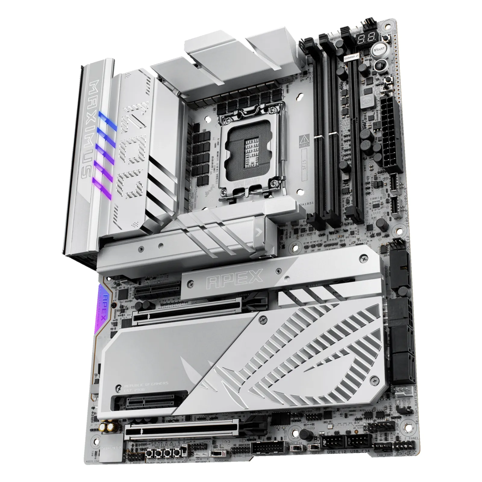 A differenza delle classiche Apex dal look più scuro, questa generazione adotta una finitura grigio ciottolo con accenti argento, pensata per integrarsi perfettamente con build bianche, silver o chiare. È una scheda madre dal forte impatto visivo, ideale per configurazioni premium che vogliono unire estetica e prestazioni.