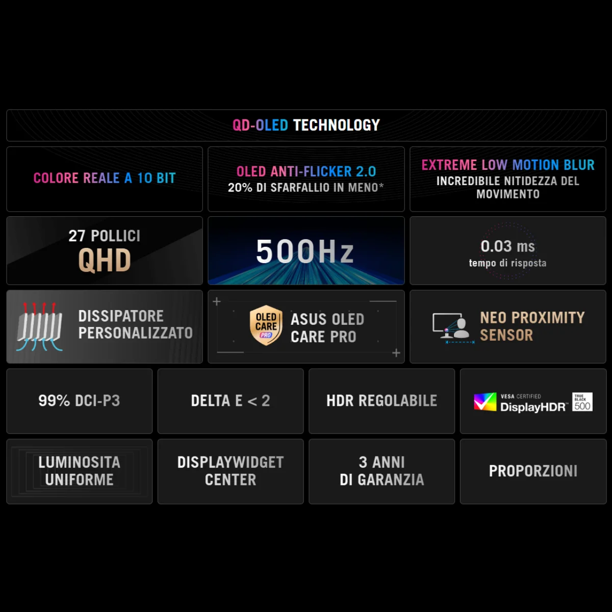 | Funzioni speciali | ROG OLED Care Pro, Neo Proximity Sensor, Screen Move, Pixel Cleaning |
