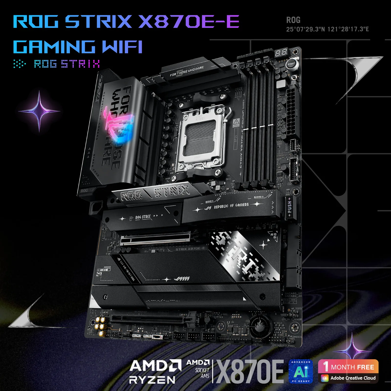 ASUS ROG STRIX X870E-E GAMING WIFI è progettata per offrire prestazioni elevate, stabilità e massima flessibilità sulle piattaforme AMD più recenti. Compatibile con i processori desktop AMD Ryzen™ serie 9000, 8000 e 7000, utilizza il chipset AMD X870E e il socket AM5 per creare build gaming e creator di fascia enthusiast.