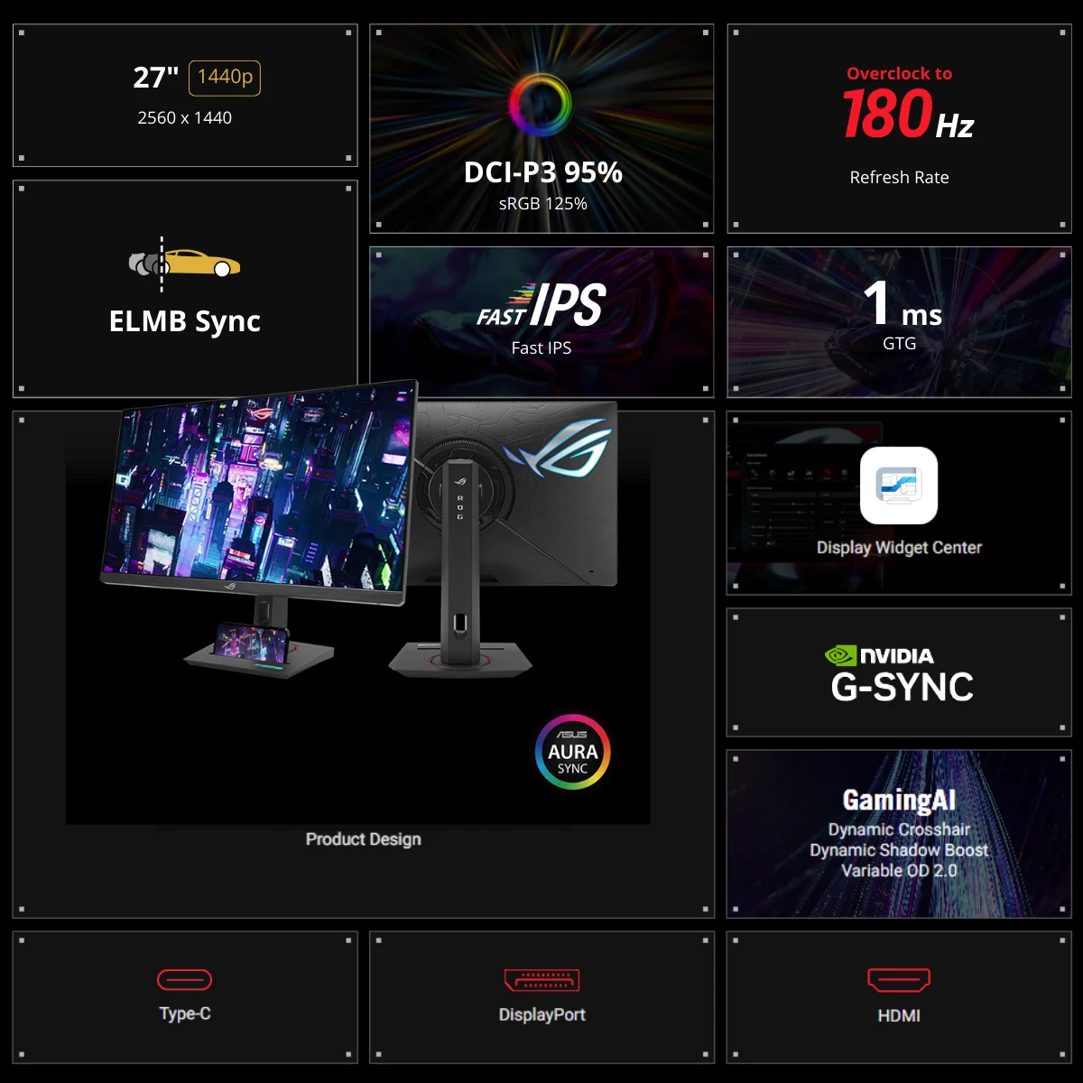 Il monitor integra la porta USB-C con DP Alt Mode per collegamenti rapidi e ordinati, oltre a supportare la personalizzazione tramite Aura Sync e la gestione semplice delle impostazioni con DisplayWidget Center. Le funzioni intelligenti della ROG Gaming A.I. completano l’esperienza, adattando dinamicamente le impostazioni per le sessioni più impegnative.