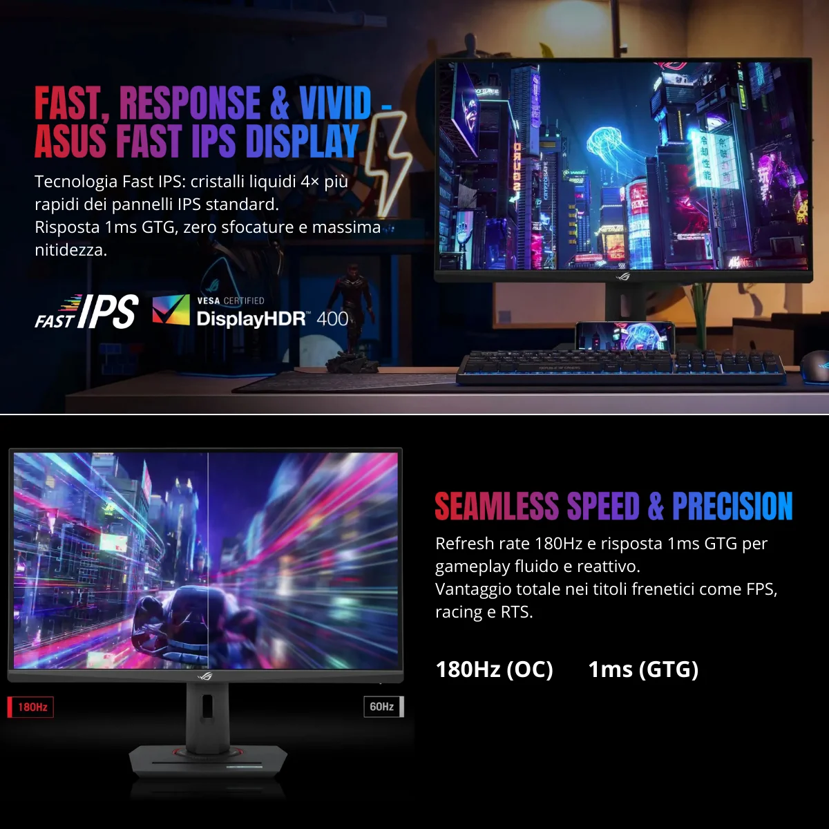 Refresh rate 180Hz e tempo di risposta 1ms GTG per gaming competitivo