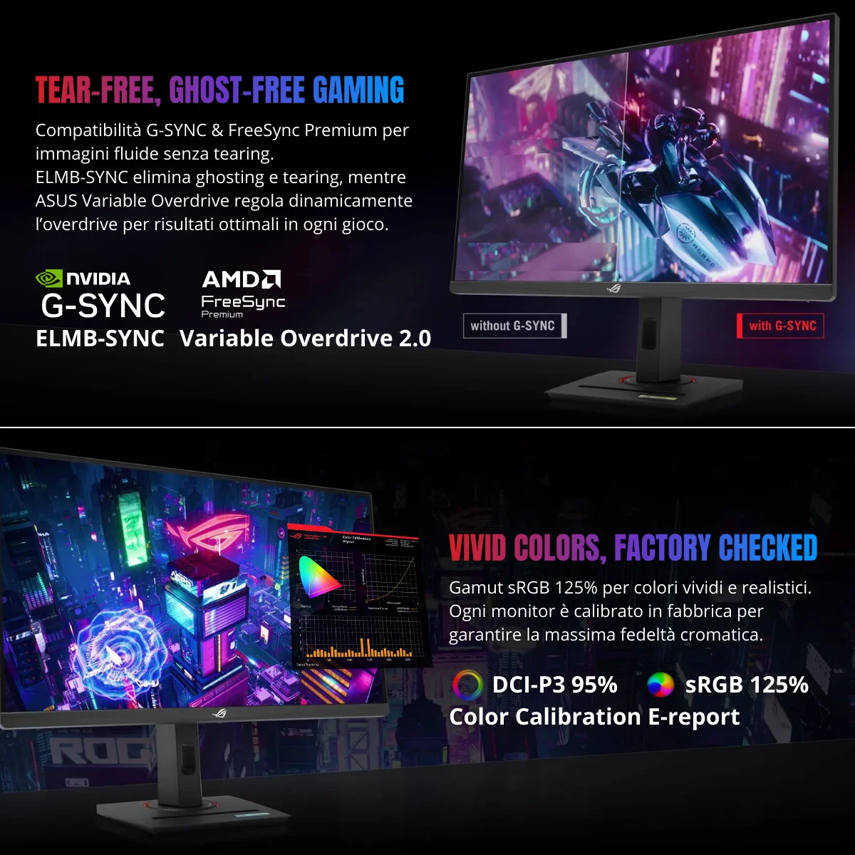 Grazie alla copertura del 95% DCI-P3 e alle tecnologie ASUS di gestione del colore, il monitor offre gradazioni cromatiche uniformi e immagini vivide, ideali non solo per il gaming ma anche per la creazione di contenuti.