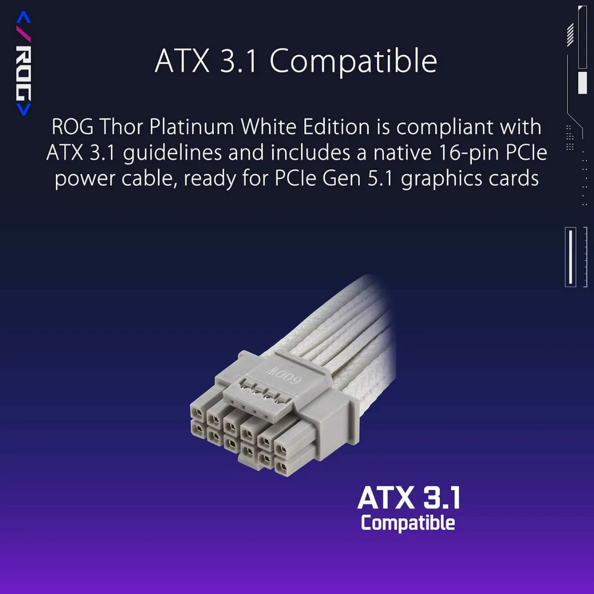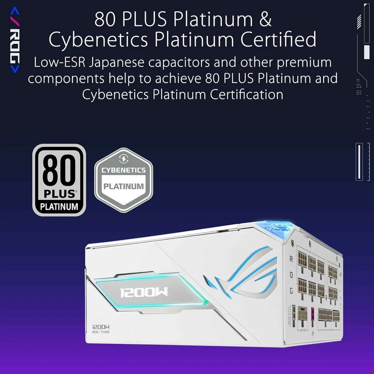 L’ASUS ROG Thor 1200W Platinum III White Edition è progettato per offrire alimentazione stabile e affidabile ai sistemi più esigenti, inclusi PC gaming enthusiast, workstation professionali e build con GPU di nuova generazione. Con una potenza totale di 1200W, è pensato per supportare configurazioni ad alto assorbimento, mantenendo efficienza elevata e controllo termico ottimale.