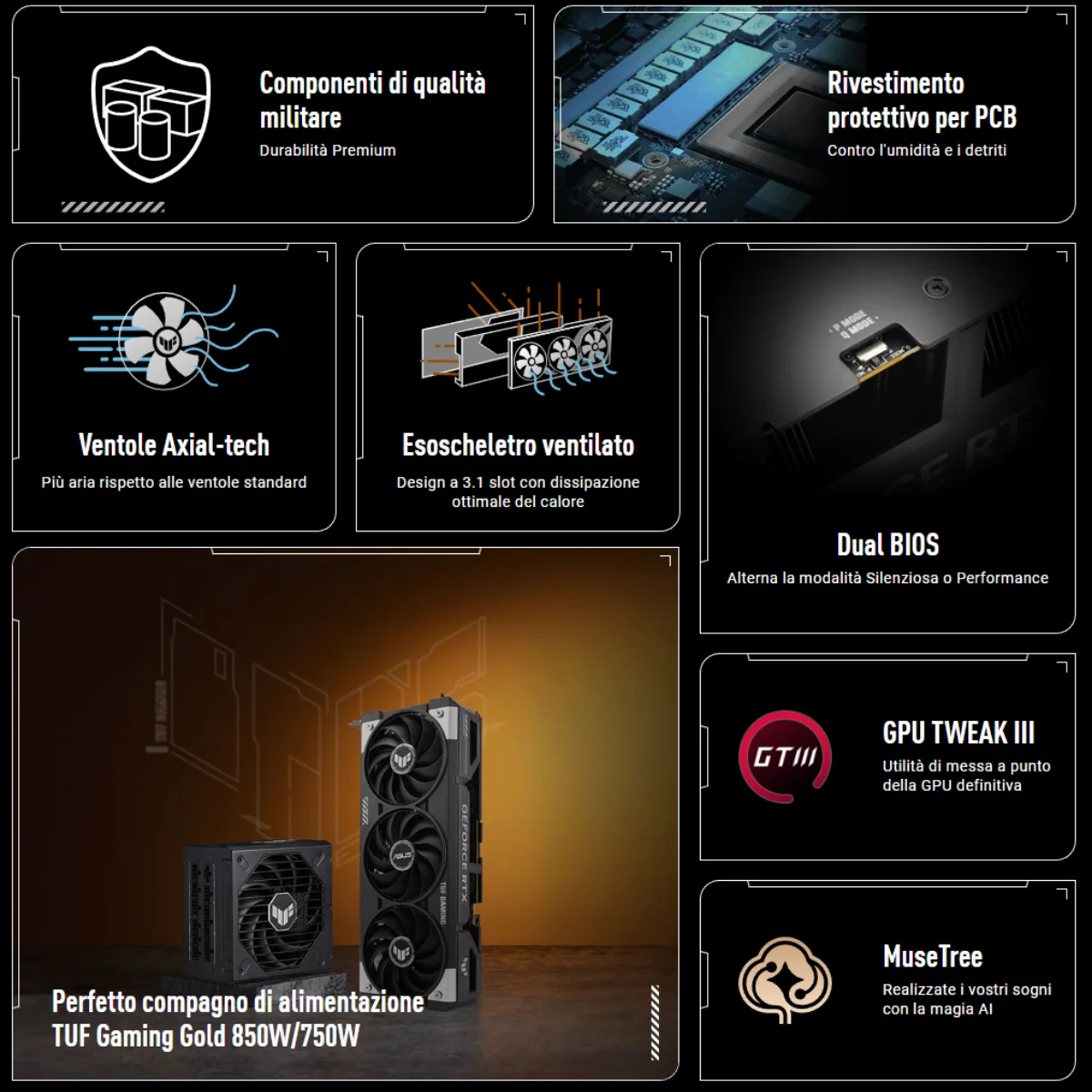 La ASUS TUF Gaming GeForce RTX™ 5060 OC 8GB GDDR7 è progettata per offrire prestazioni elevate, massima affidabilità e lunga durata. Basata su architettura NVIDIA Blackwell, integra DLSS 4, Ray Tracing avanzato, raffreddamento Axial-tech a tripla ventola e componenti Military-Grade, rendendola ideale per gaming moderno e creazione di contenuti.