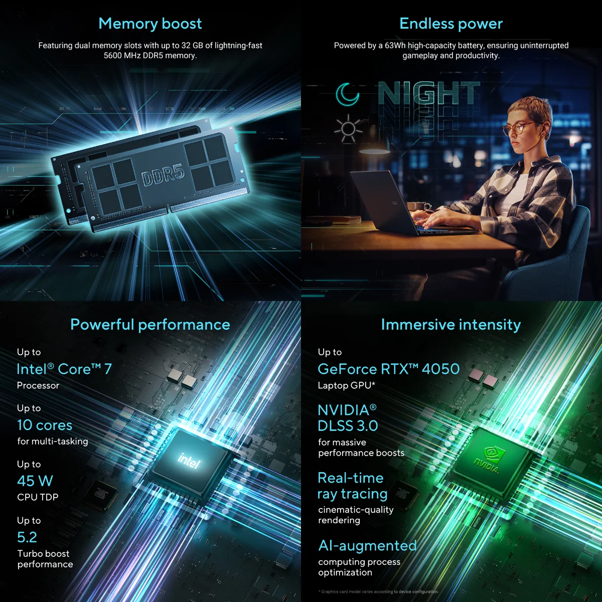 NVIDIA® GeForce RTX™ 4050 Laptop GPU 6GB GDDR6 powers advanced AI with 194 AI TOPS |