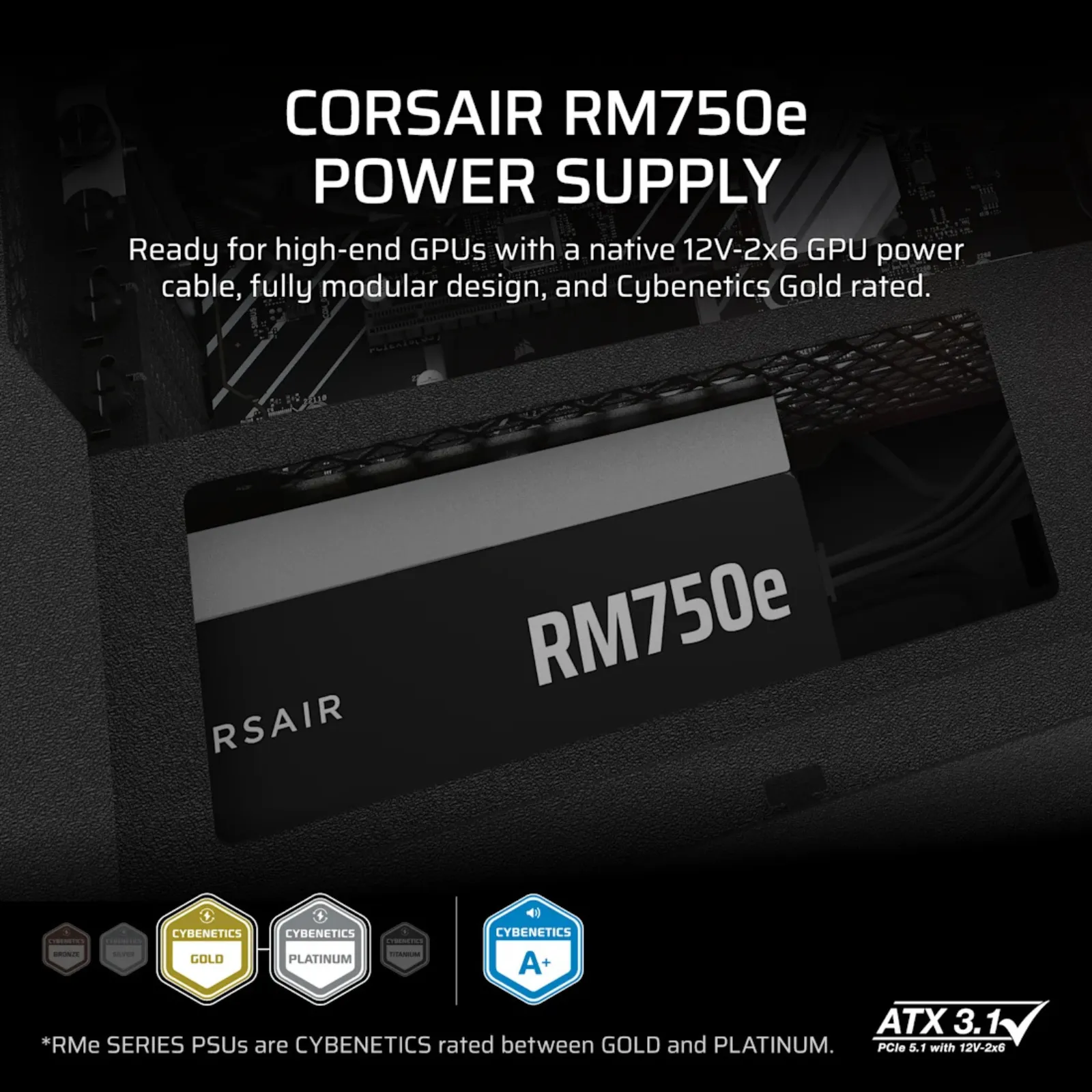 CORSAIR RM750e (2025) – Alimentatore ATX 750W Modulare ATX 3.1 PCIe 5.1 Cybenetics Gold con 12V-2×6 per GPU