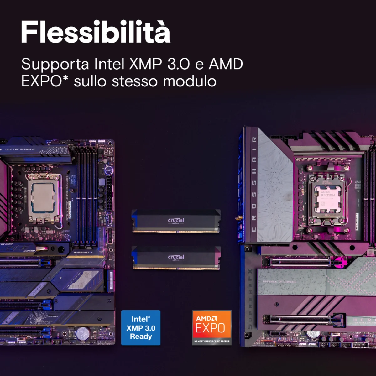 La Crucial Pro DDR5 64GB (2×32GB) 6000MHz CL40 OC è una memoria gaming e professionale ad alte prestazioni progettata per sistemi di nuova generazione. Grazie alla DDR5 a bassa latenza, al supporto Intel XMP 3.0 e AMD EXPO, e all’affidabilità Micron, garantisce velocità elevate, grande stabilità e prestazioni costanti anche con applicazioni e giochi AAA ad alto consumo di memoria.