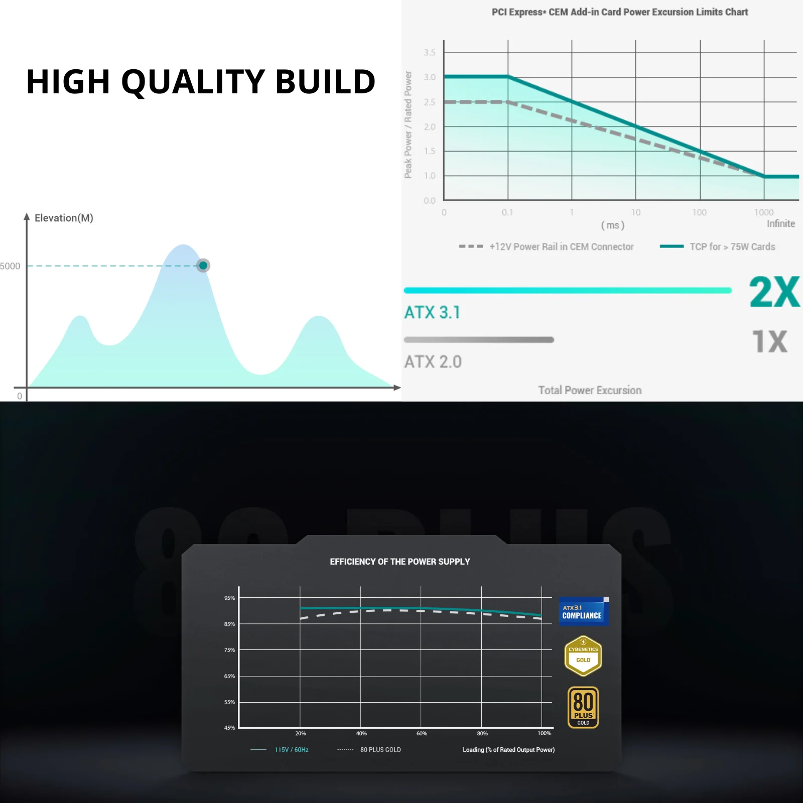 Alimentatore da 850W ATX12V V3.1 completamente modulare con certificazione 80 PLUS Gold, cavi sleevati, ventola FDB da 120mm e supporto PCIe 5.1 tramite cavo 12V-2×6 da 600W. Progettato per garantire affidabilità, silenziosità ed efficienza energetica.