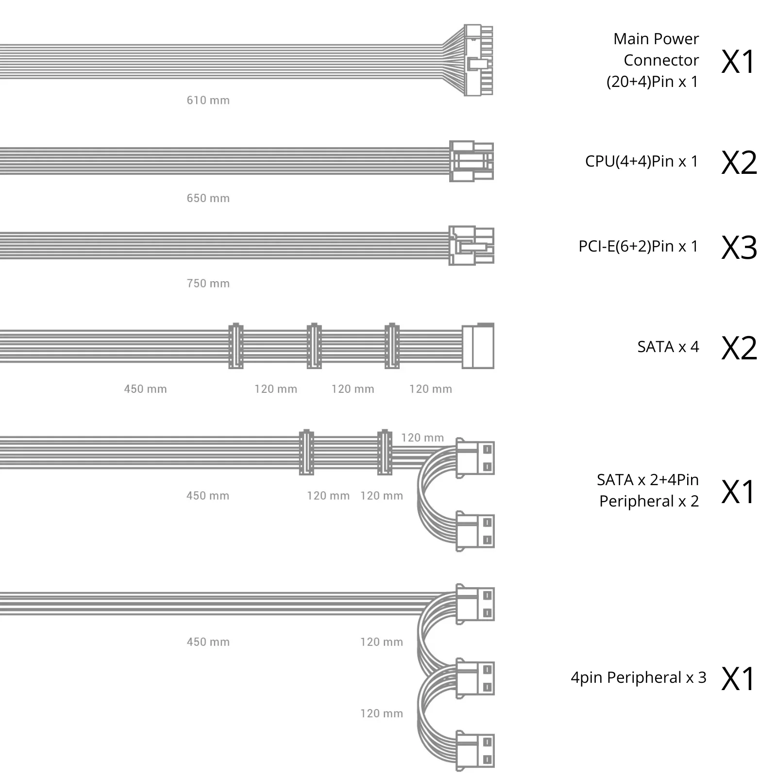 | Main Power (20+4 pin) | 1 | 610 mm | 1 |