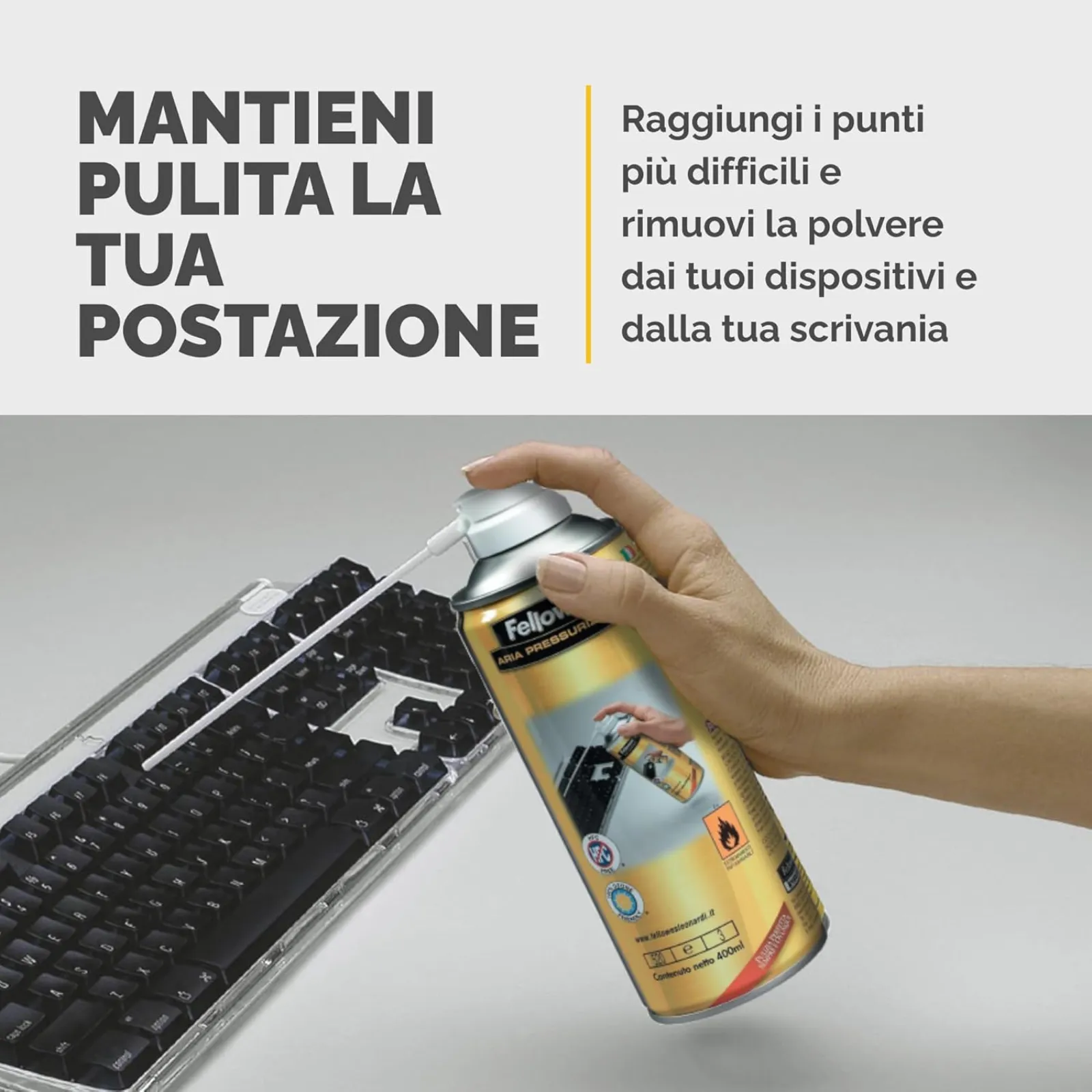 La Fellowes 99676I è una bomboletta di aria compressa da 400 ml progettata per la pulizia efficace di dispositivi elettronici. Con getto potente e ugello di precisione, rimuove polvere e residui anche nelle zone difficili, senza lasciare tracce e senza CFC.