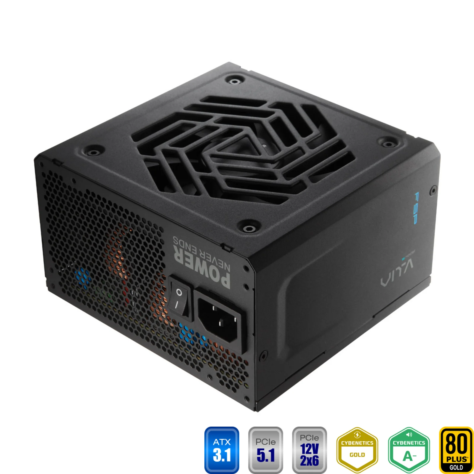 Alimentatore modulare da 1000W con certificazione 80 PLUS Gold e standard ATX 3.1. Efficienza fino al 90%, ventola silenziosa da 120 mm con cuscinetto idraulico e cablaggio completamente modulare. Dotato di connettore 12V-2×6 per GPU PCIe 5.1, è perfetto per build moderne e future.