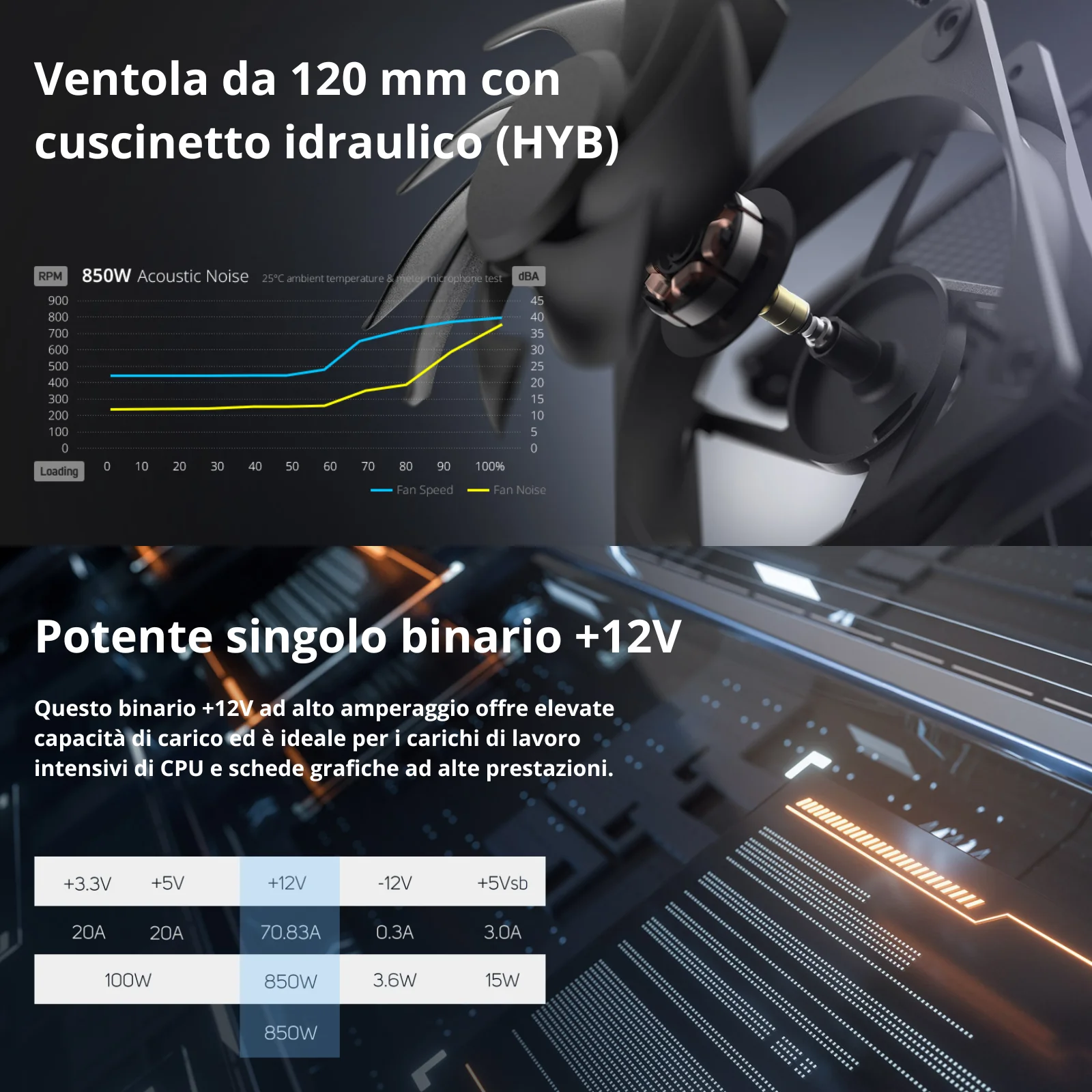 Con una efficienza tipica ≥ 90%, supportata dalla certificazione 80 PLUS Gold e Cybenetics Gold A-, questo alimentatore garantisce prestazioni stabili e consumi ottimizzati. I condensatori giapponesi a 105°C assicurano qualità, longevità e stabilità anche in condizioni estreme.
