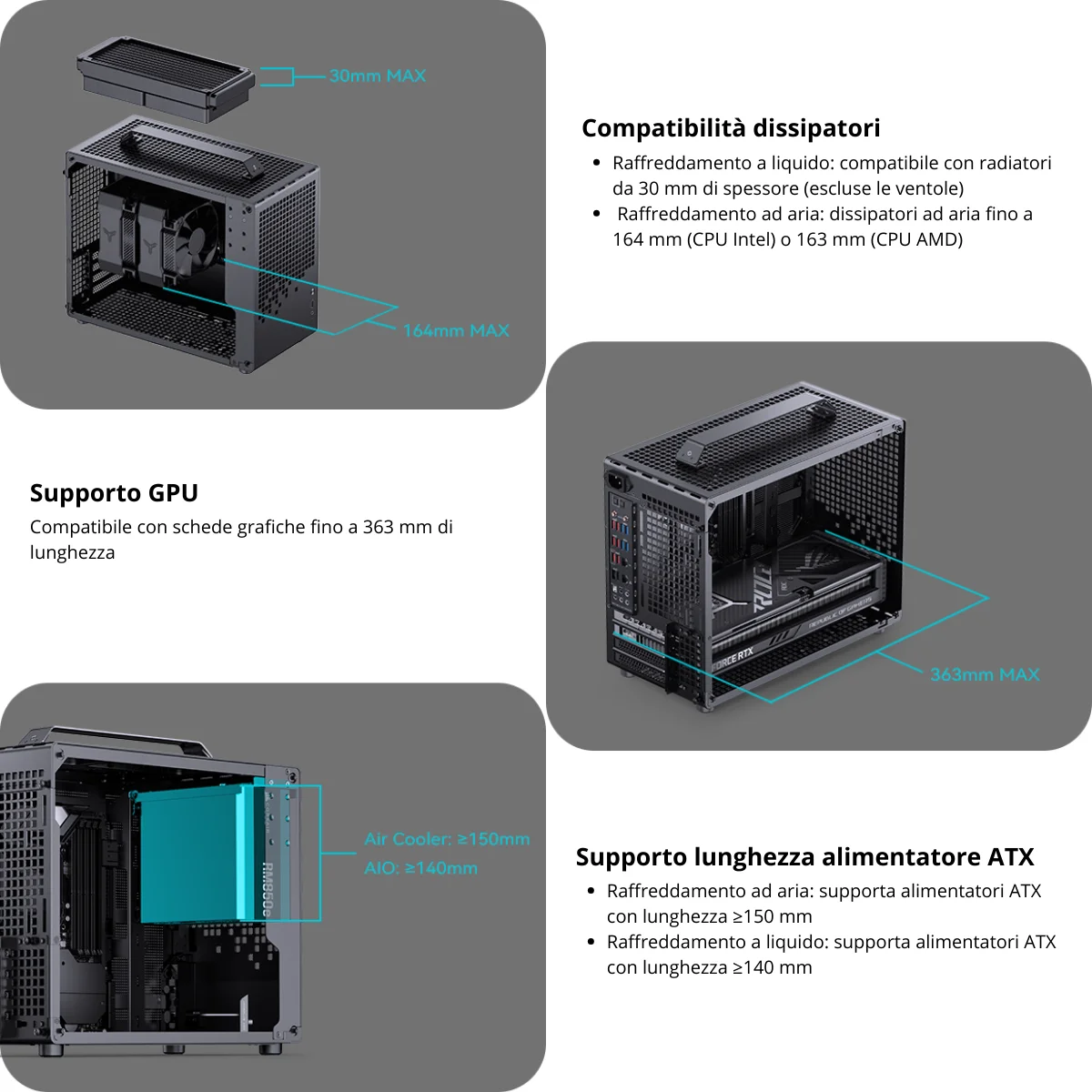 Alimentatori ATX compatibili: fino a 150mm (aria) o 140mm (liquido).