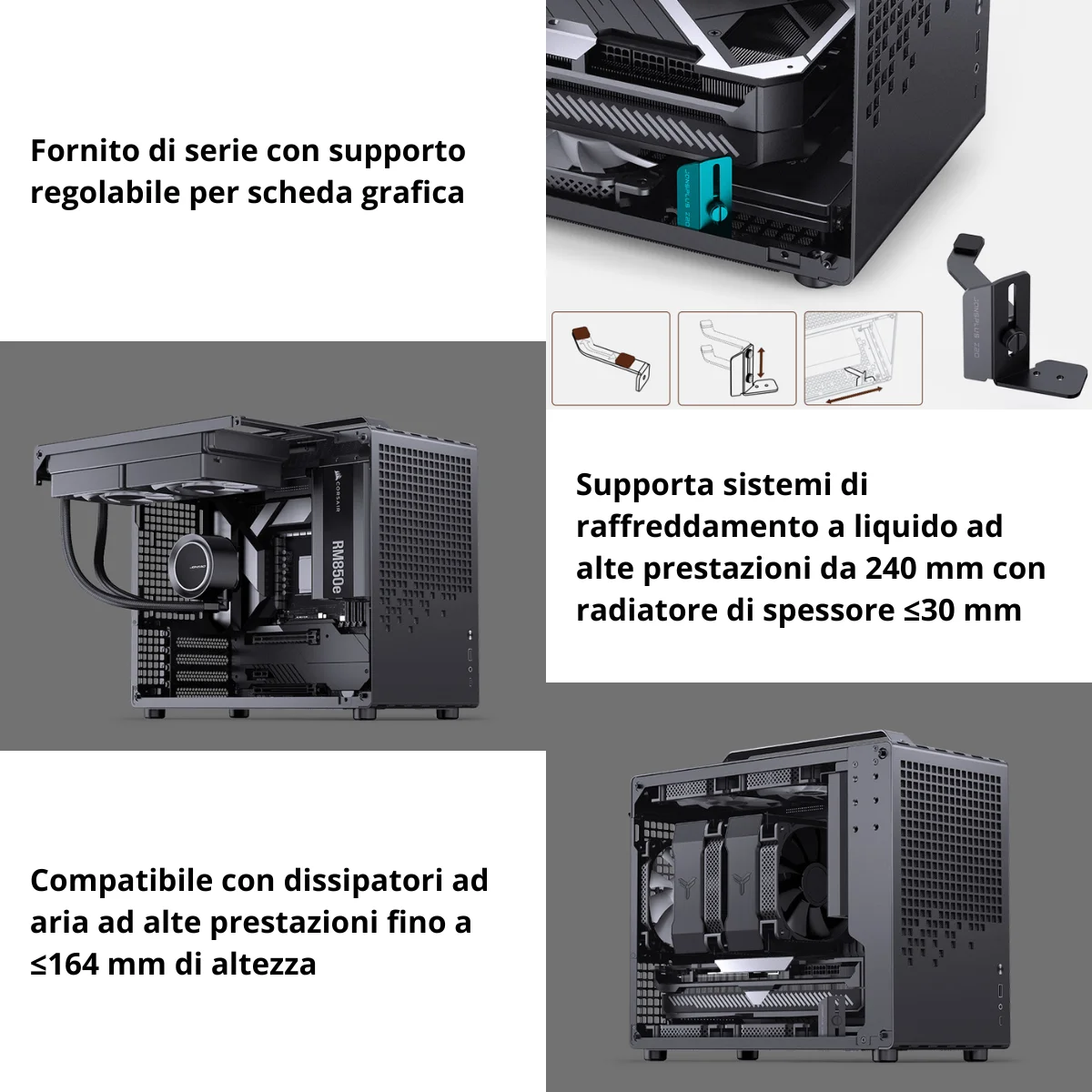 In modalità ad aria, il case supporta dissipatori CPU fino a 164mm (Intel) o 163mm (AMD), mentre in modalità a liquido può ospitare un radiatore da 240mm (30mm radiatore + 30mm ventole). La compatibilità con schede video fino a 363mm e schede madri Micro-ATX full-size lo rende ideale anche per build gaming potenti.