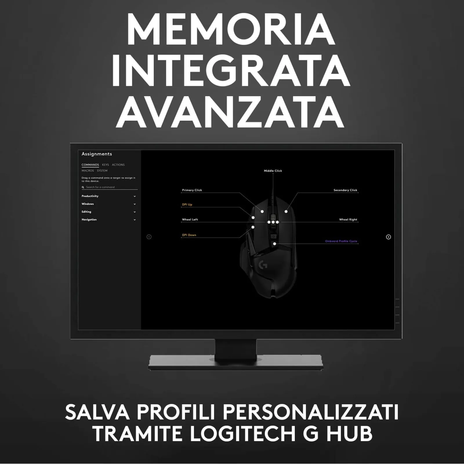 Il Logitech G502 HERO è un mouse gaming cablato ad alte prestazioni con sensore HERO 25K fino a 25.600 DPI, 11 pulsanti programmabili e sistema di pesi regolabili fino a 18 g. Dotato di illuminazione LIGHTSYNC RGB e polling rate a 1000 Hz, offre precisione professionale, personalizzazione avanzata e controllo totale.