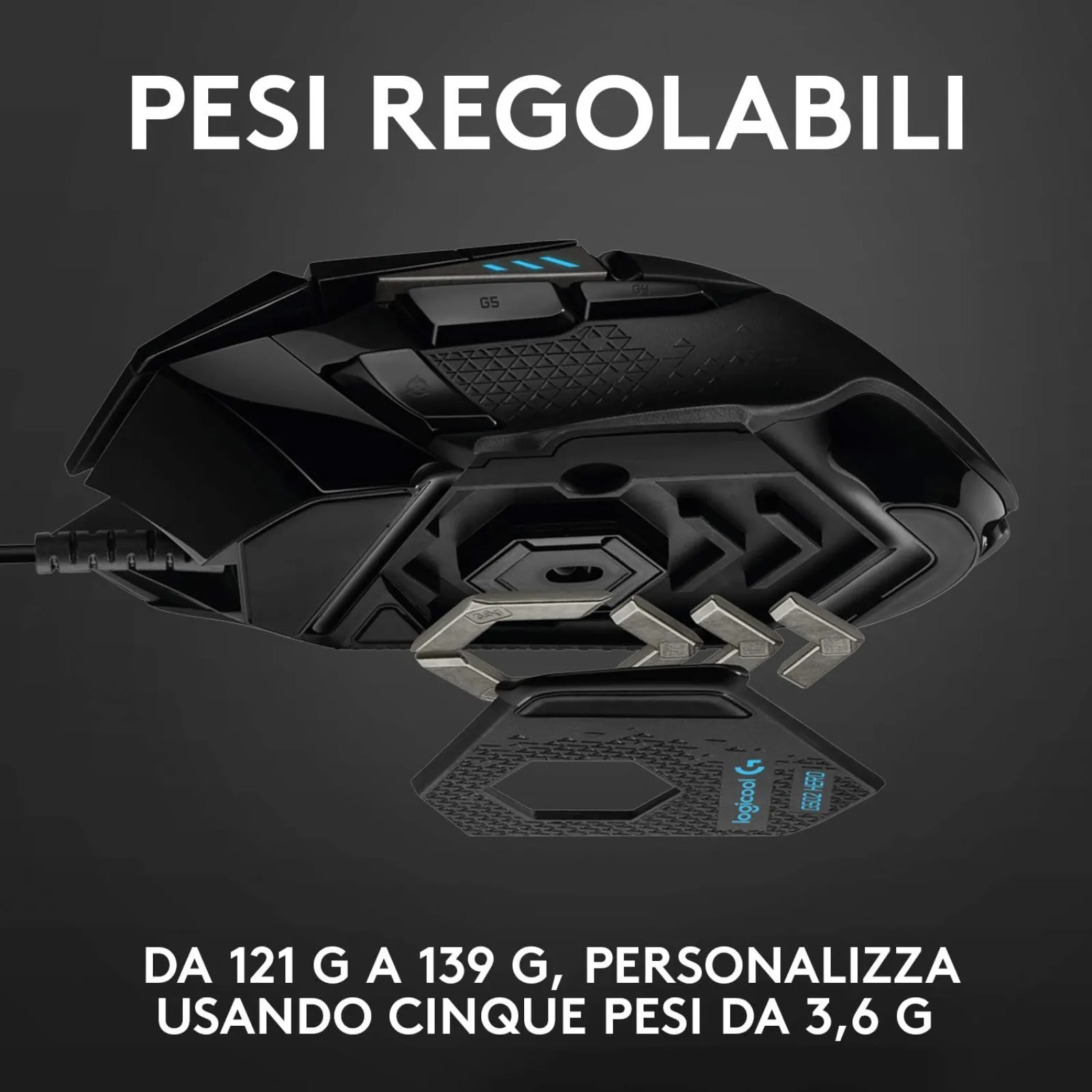 Il G502 HERO include 5 pesi da 3,6 g, per un totale di 18 g aggiuntivi, posizionabili in diverse configurazioni: