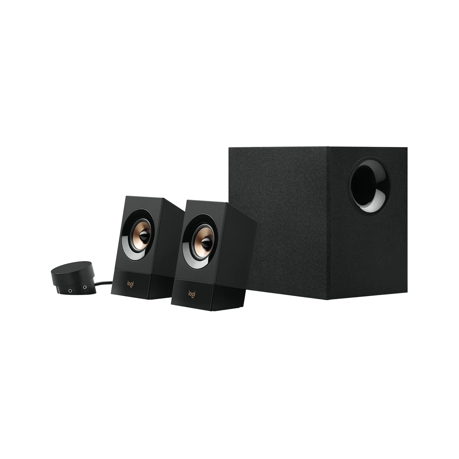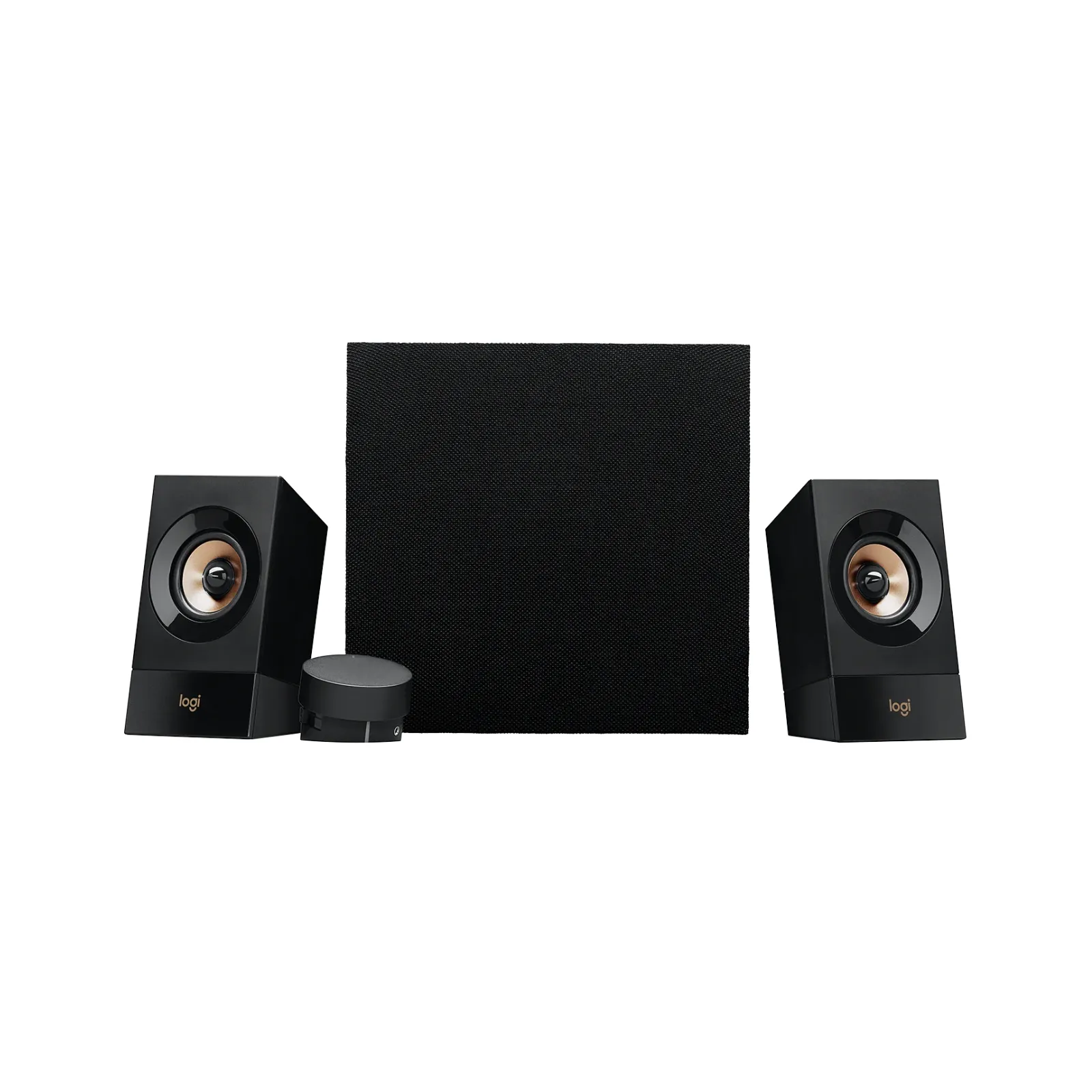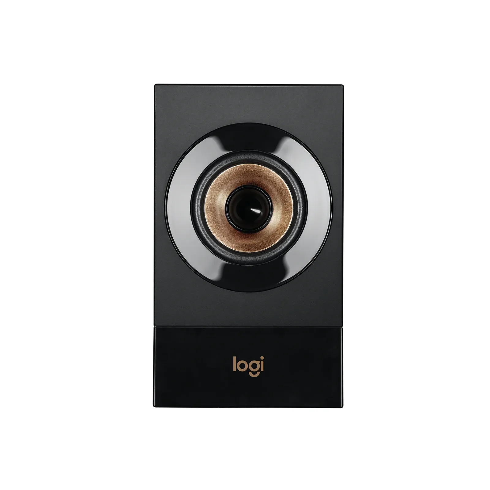 Il Logitech Z533 presenta un design moderno con finitura nero e oro, che lo rende elegante e adatto a qualsiasi ambiente domestico o postazione gaming.
