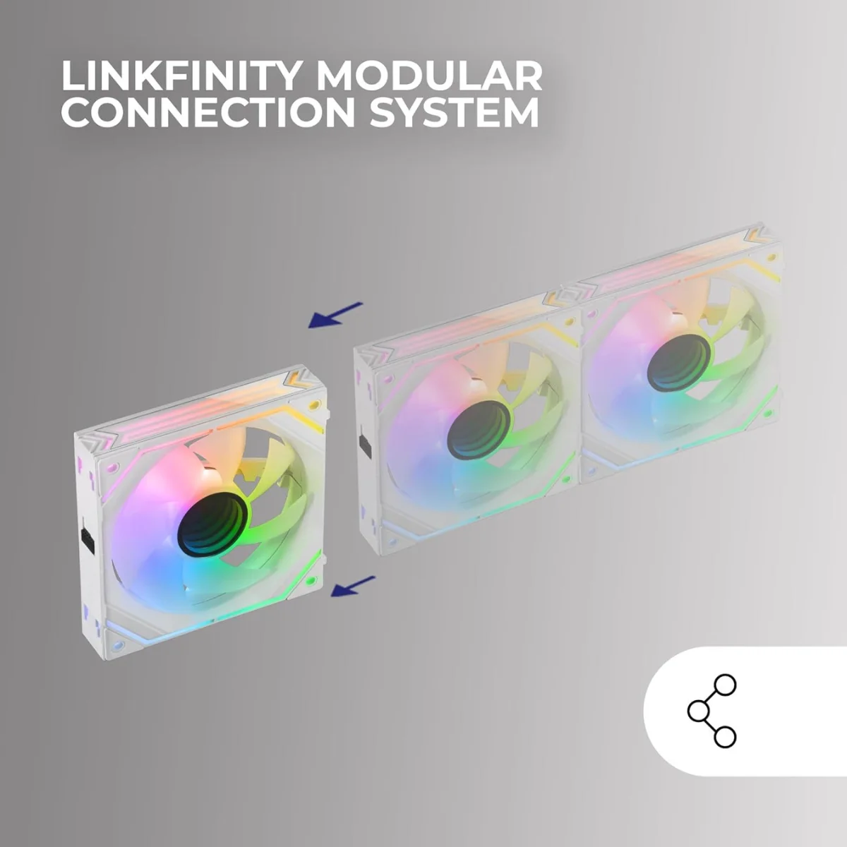 Il Mars Gaming MF-LINKFINITYKIT White è un kit da 3 ventole PWM da 120 mm con spettacolare Infinity Mirror ARGB a 360° e cornice laterale ARGB dinamica. Grazie all’esclusivo sistema modulare LinkFinity, al controller ARGB incluso e al controllo PWM, offre prestazioni elevate, silenziosità estrema e un cable management pulito, ideale per build white gaming di forte impatto visivo.