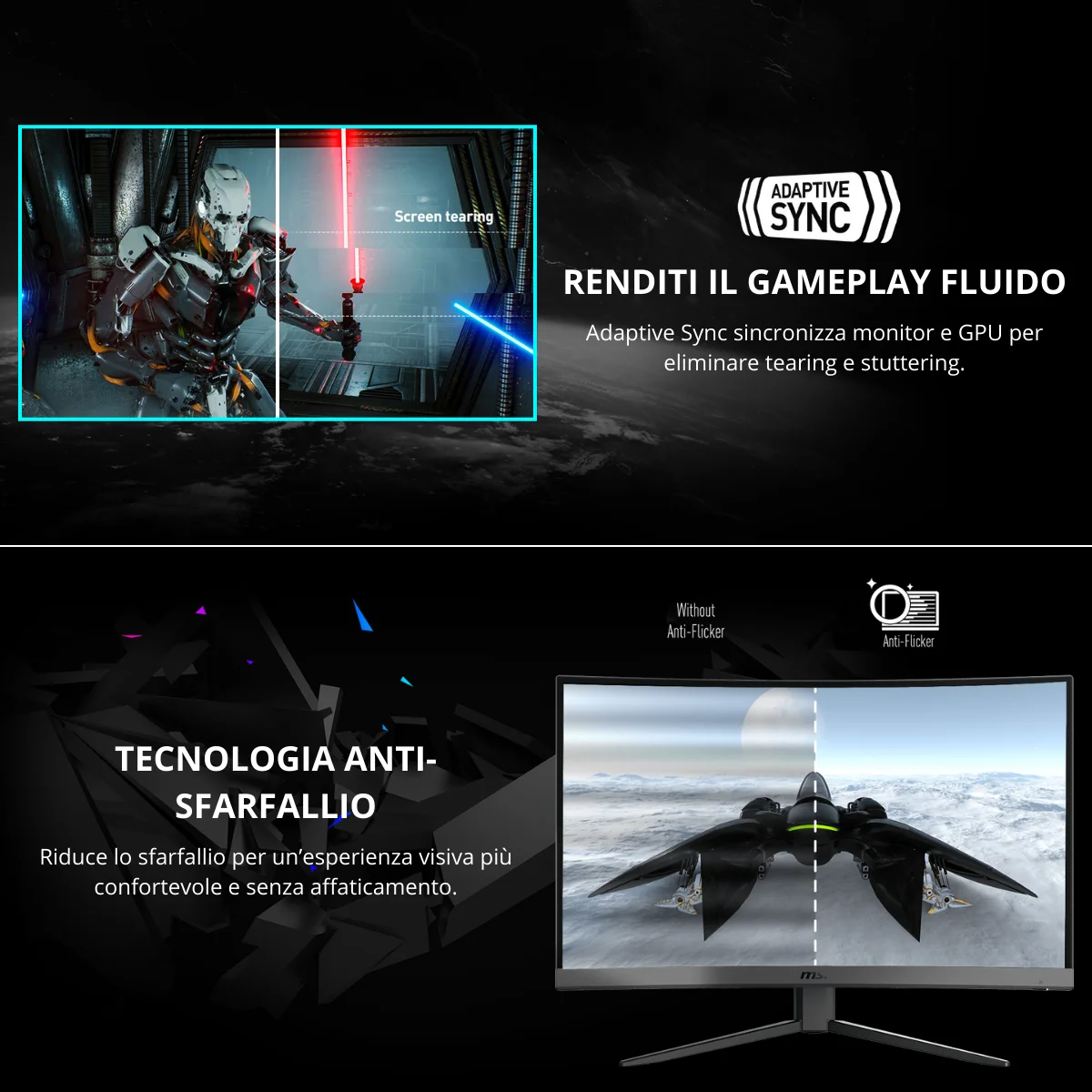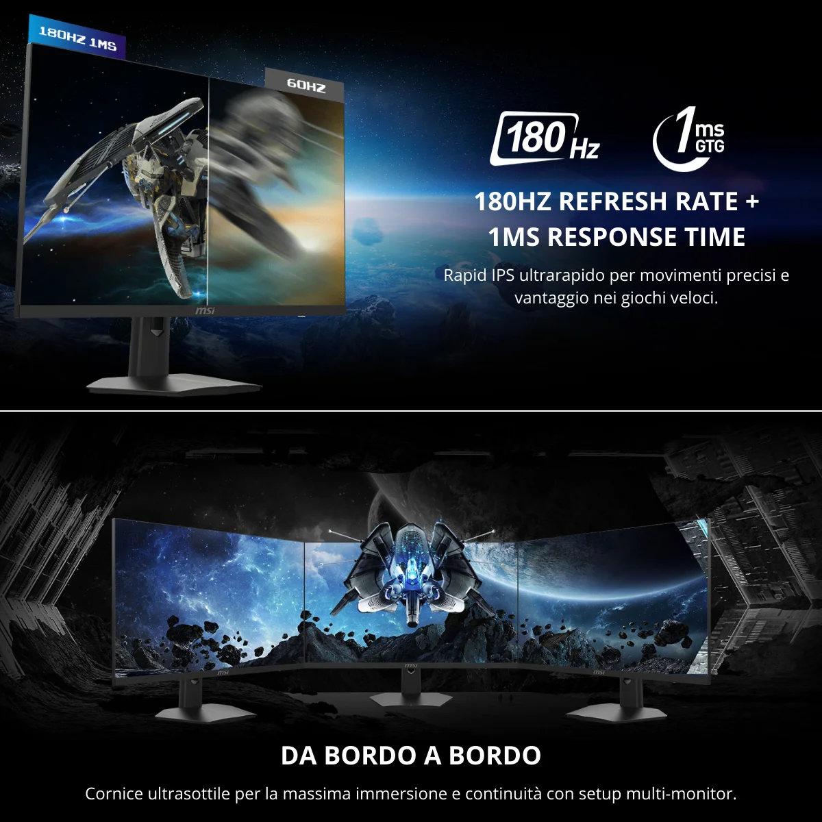 Il MSI G24C6P E2 è progettato per chi cerca un’esperienza di gioco immersiva e reattiva. Il display curvo 1500R avvolge lo sguardo e amplifica la sensazione di realismo, mentre la frequenza di aggiornamento di 180Hz e il tempo di risposta di 1ms garantiscono immagini fluide e reattive, ideali per i giochi più competitivi.