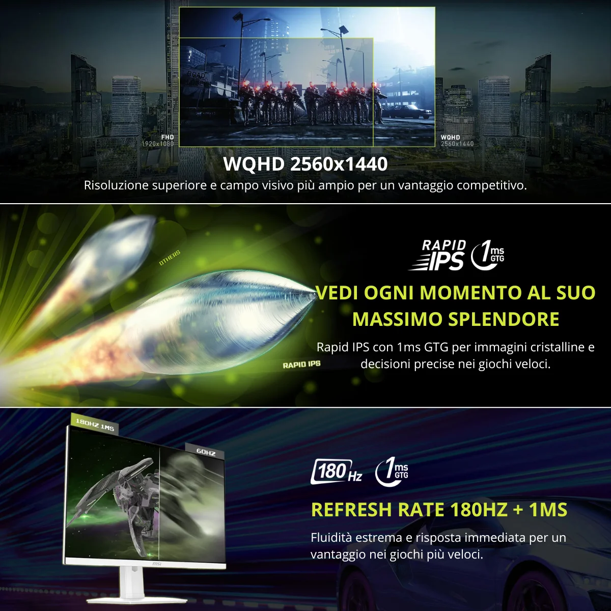 Con la risoluzione WQHD (2560×1440) e la frequenza di aggiornamento a 180Hz, abbinata a un tempo di risposta di soli 1ms GtG, questo monitor assicura reattività immediata e movimenti fluidi, ideali per i giochi competitivi.