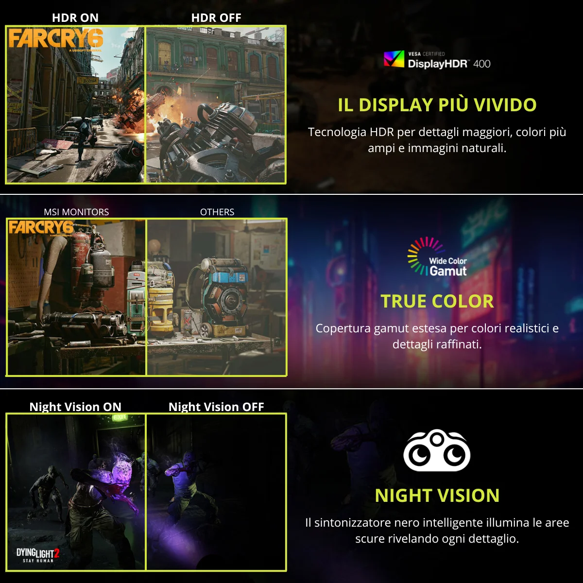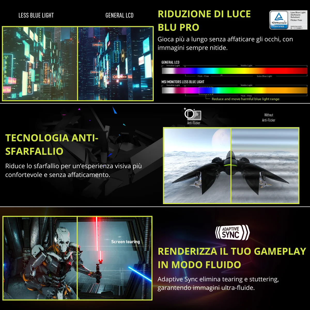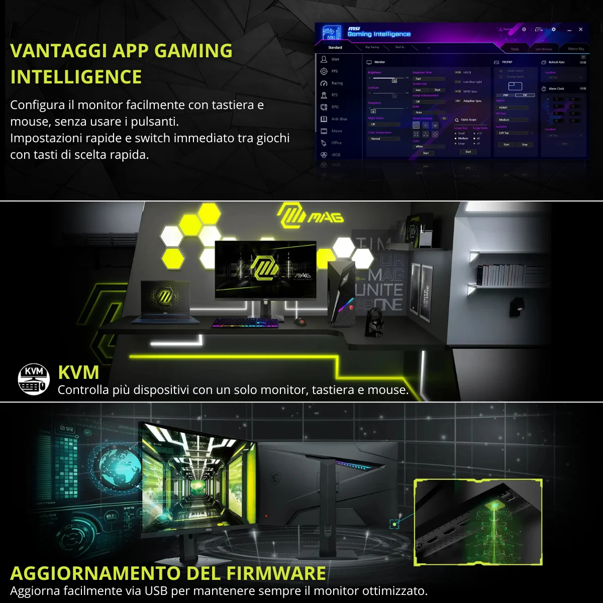 La tecnologia Adaptive-Sync elimina tearing e stuttering, mentre la certificazione VESA DisplayHDR 400 eleva i contrasti e rende più realistici colori e ombre. L’integrazione con Mystic Light RGB permette di personalizzare l’illuminazione, mentre l’app Gaming Intelligence consente di creare profili ottimizzati per ogni titolo.