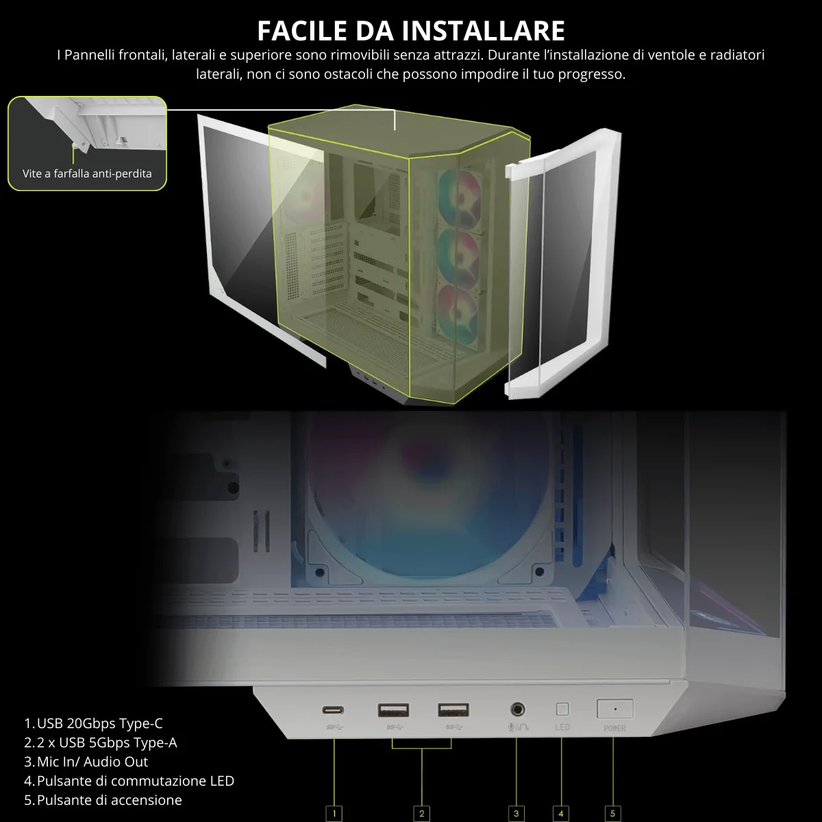Un case elegante, moderno e potente: la scelta ideale per gamer e creatori che vogliono un PC dallo stile unico e dalle prestazioni impeccabili.