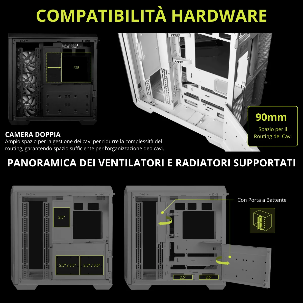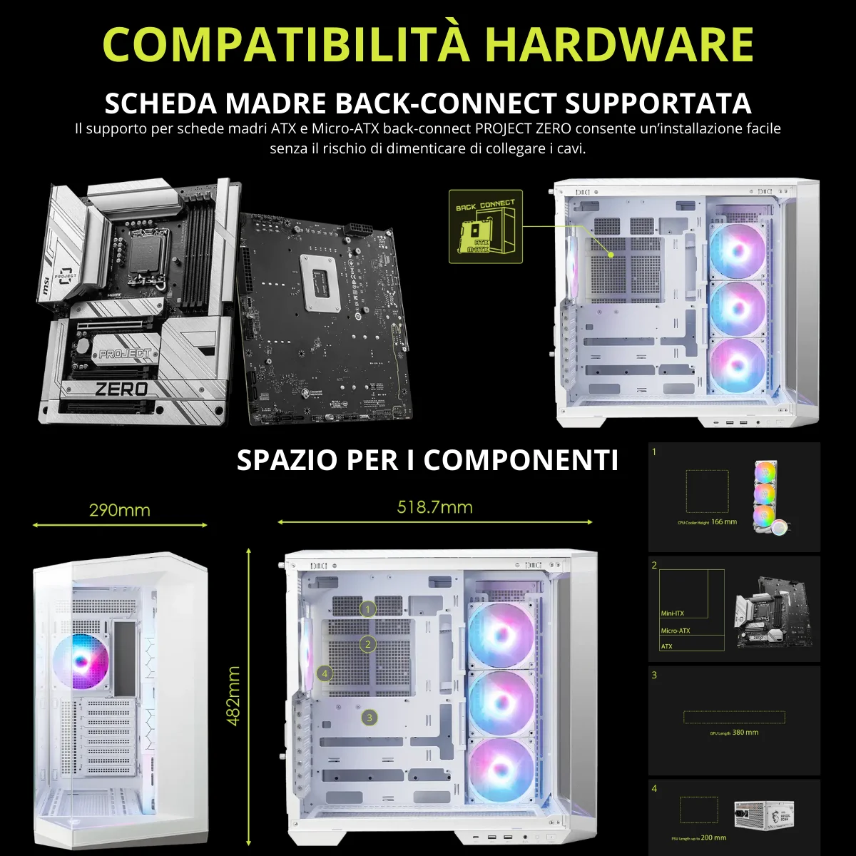 Pensato per schede madri ATX e Micro-ATX con connettore posteriore, garantisce un’installazione ordinata e un flusso d’aria ottimizzato. Supporta radiatori fino a 360 mm in tre posizioni (superiore, laterale e inferiore), offrendo la massima flessibilità per configurazioni ad aria o a liquido ad alte prestazioni.