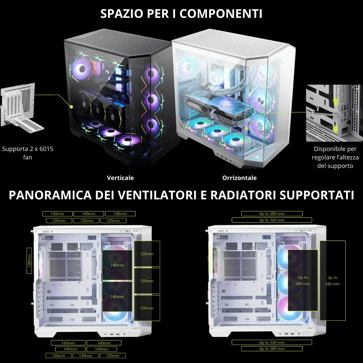 Supporto radiatori: fino a 360 mm (superiore, laterale, inferiore).