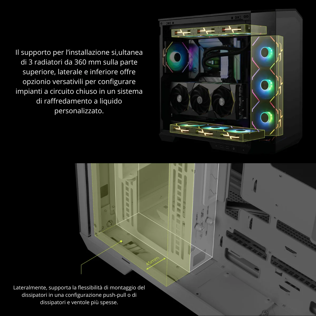 Sì, supporta radiatori da 360 mm su top, lato e bottom.