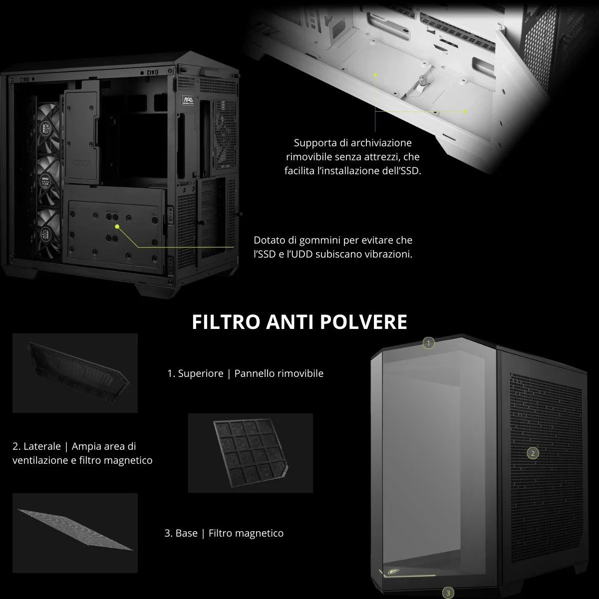 Filtri antipolvere rimovibili (top, lato, fondo) per una manutenzione semplificata.