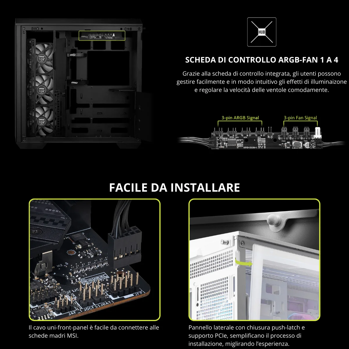 Il case è dotato di 3 ventole ARGB Reverse-blade da 120 mm sui lati e 1 ventola ARGB da 120 mm sul retro, già sincronizzabili tramite controller incluso o scheda madre compatibile MSI. L’illuminazione può essere facilmente personalizzata per creare effetti di luce spettacolari e coordinati con il resto del sistema.