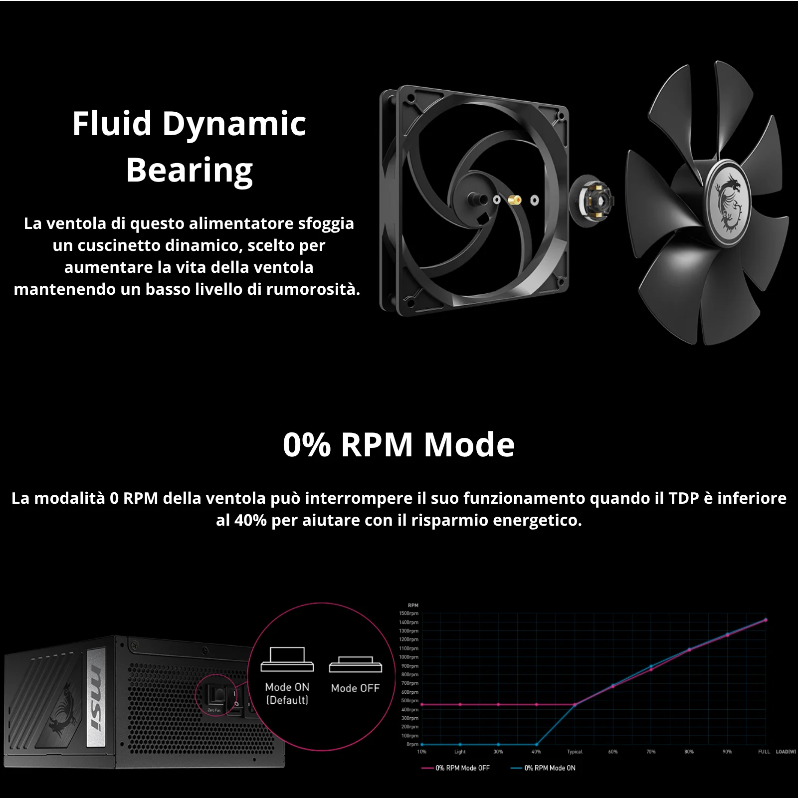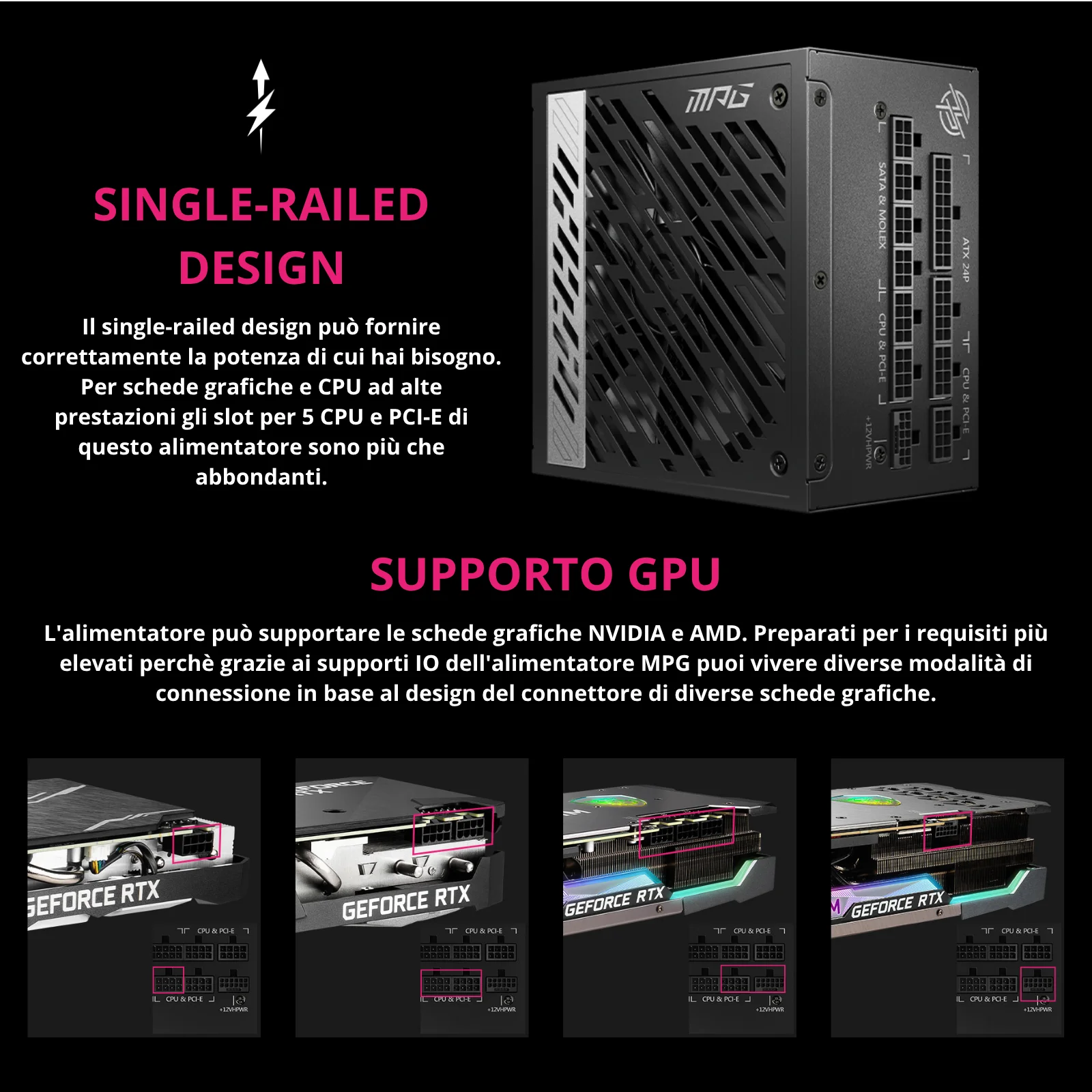 L’MSI MPG A1000G PCIE5 è un alimentatore ATX da 1000W progettato per offrire potenza stabile e silenziosa ai sistemi di nuova generazione. Con certificazione 80 PLUS Gold, garantisce alta efficienza energetica e minori sprechi durante l’uso quotidiano.