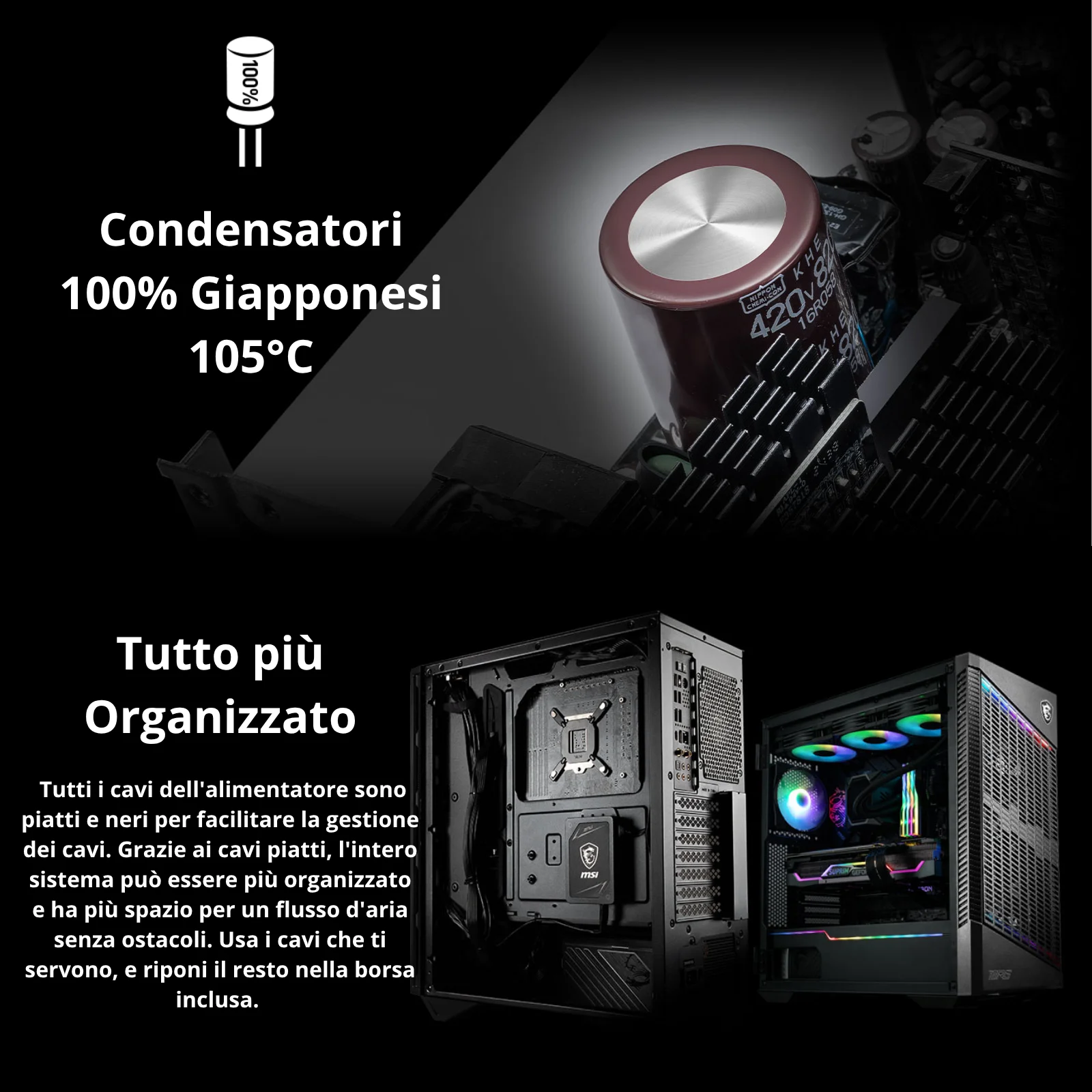 Con componentistica di alta qualità, come i condensatori 100% giapponesi da 105°C, e un sistema completo di protezioni industriali (OVP, OCP, OPP, OTP, SCP, UVP), l’MPG A1000G PCIE5 rappresenta una scelta affidabile e sicura per le build di fascia alta.