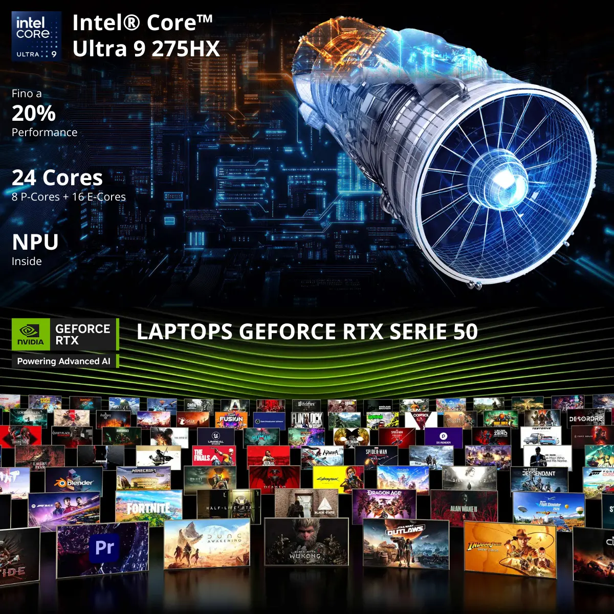 Processore: Intel® Core™ Ultra 9 275HX (fino a 5.4GHz, 24 core, 24 thread) con Intel® AI Boost.
